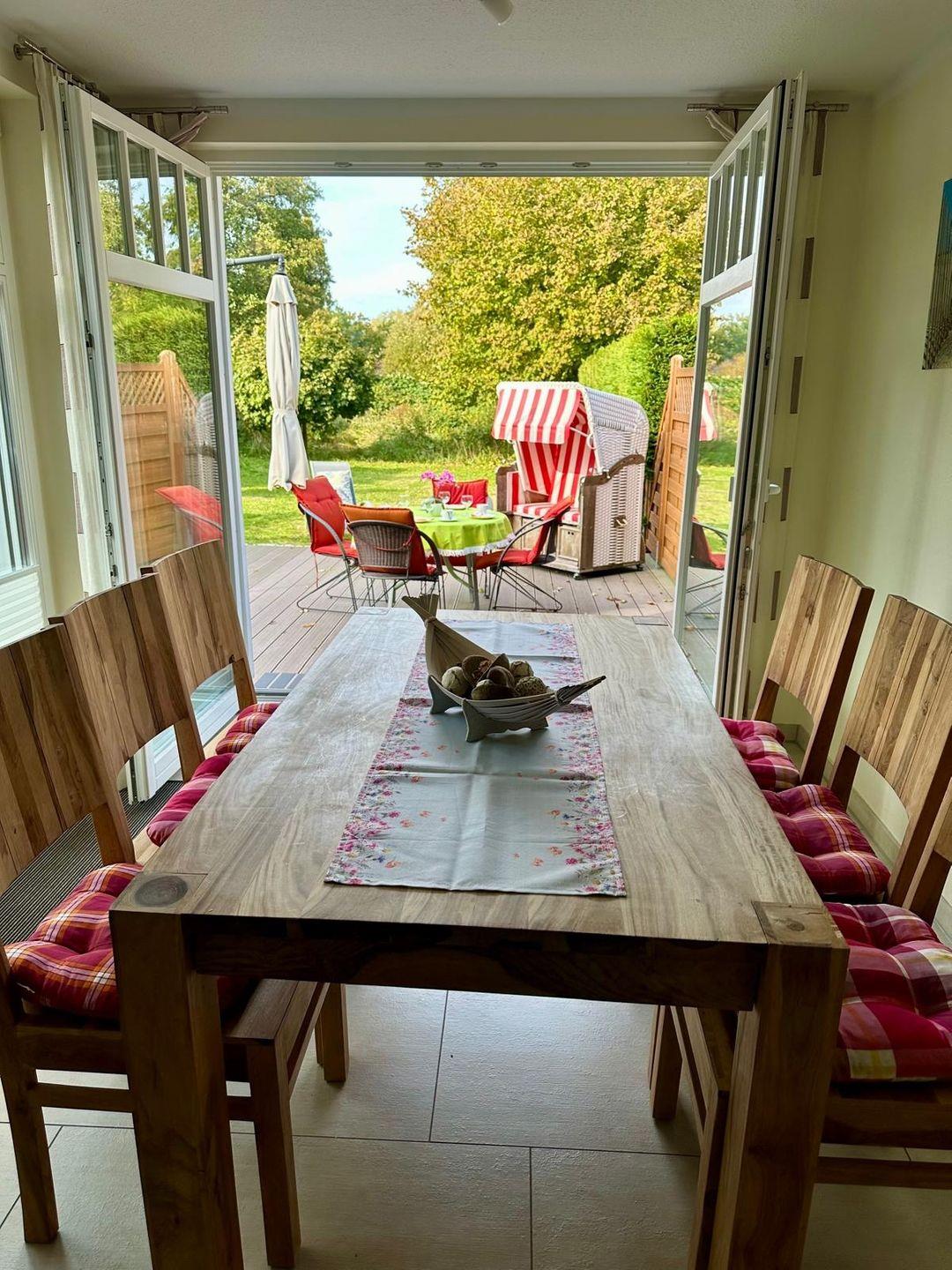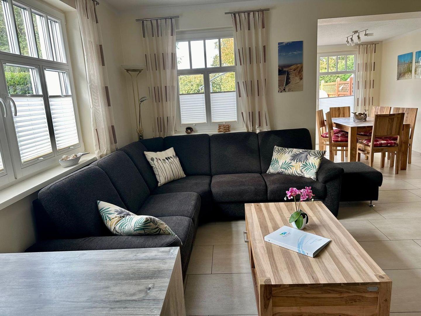 Wohnraum mit Ledereckcouch, Wintergarten mit Esstisch für 6 Personen