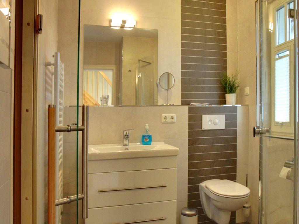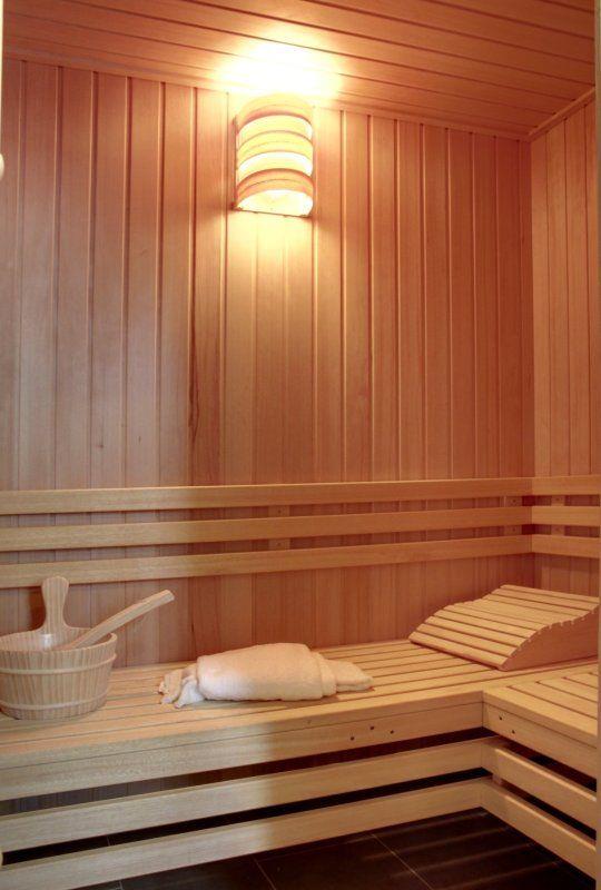Badezimmer mit ebenerdiger Dusche und anliegender Sauna