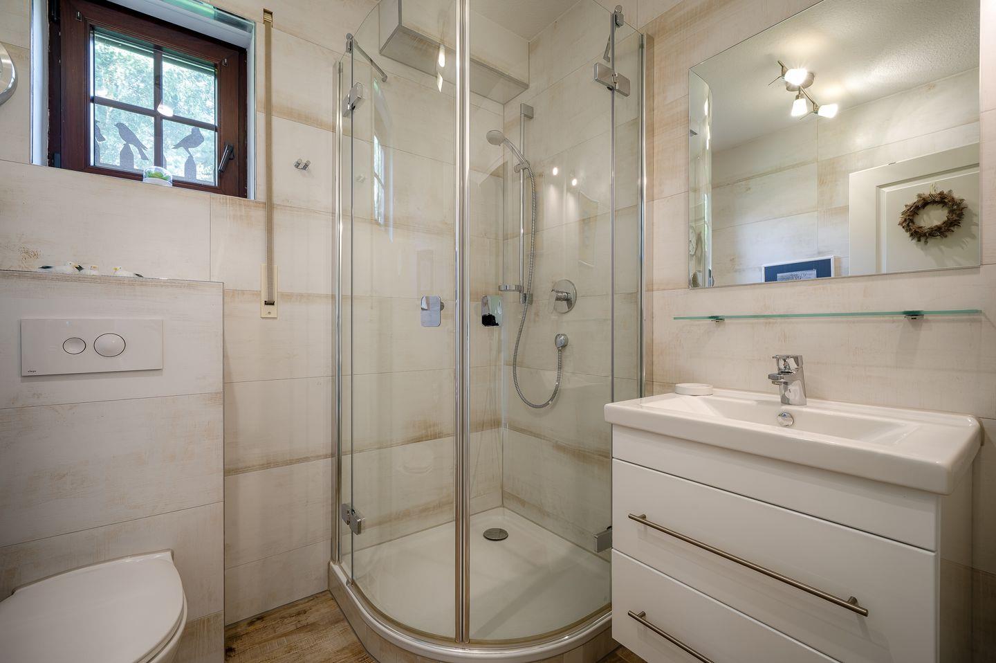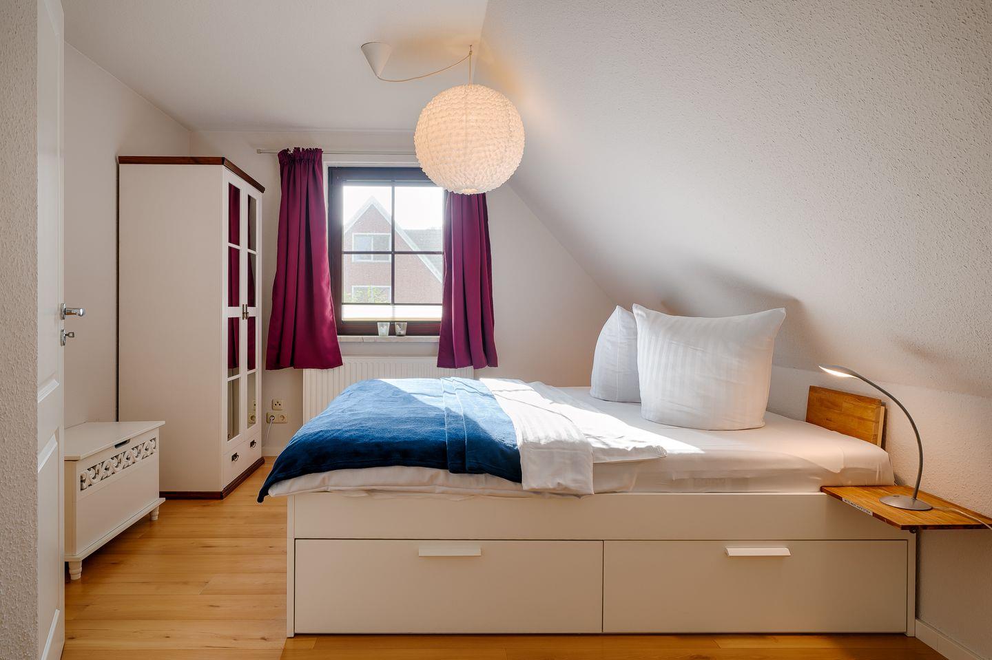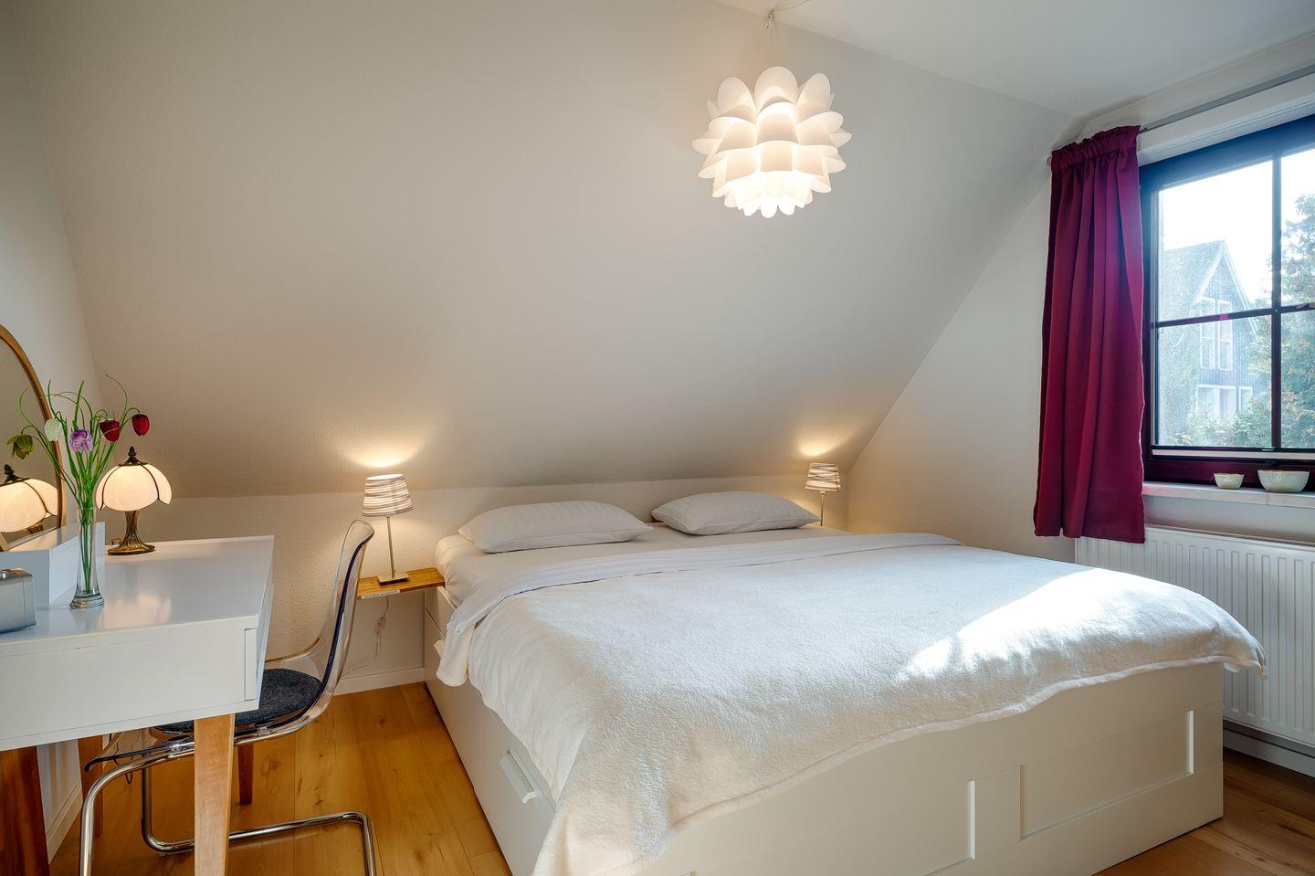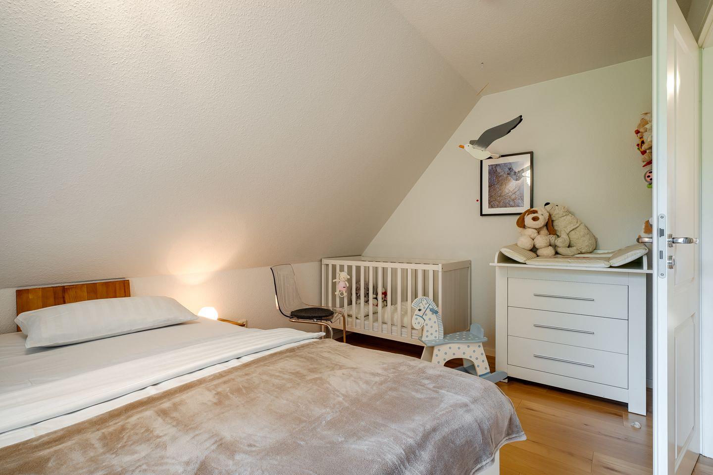1 Schlafzimmer mit Doppelbett (1,80x2,00m), Anti-Kartell-Matratzen, 4-Zonen-Komfort-Lattenroste, Wickelkommode, festes Kinderbett inkl. Matratze