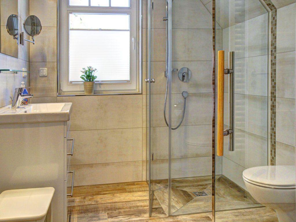 Tageslichtbad mit ebenerdiger Dusche, anliegender Sauna