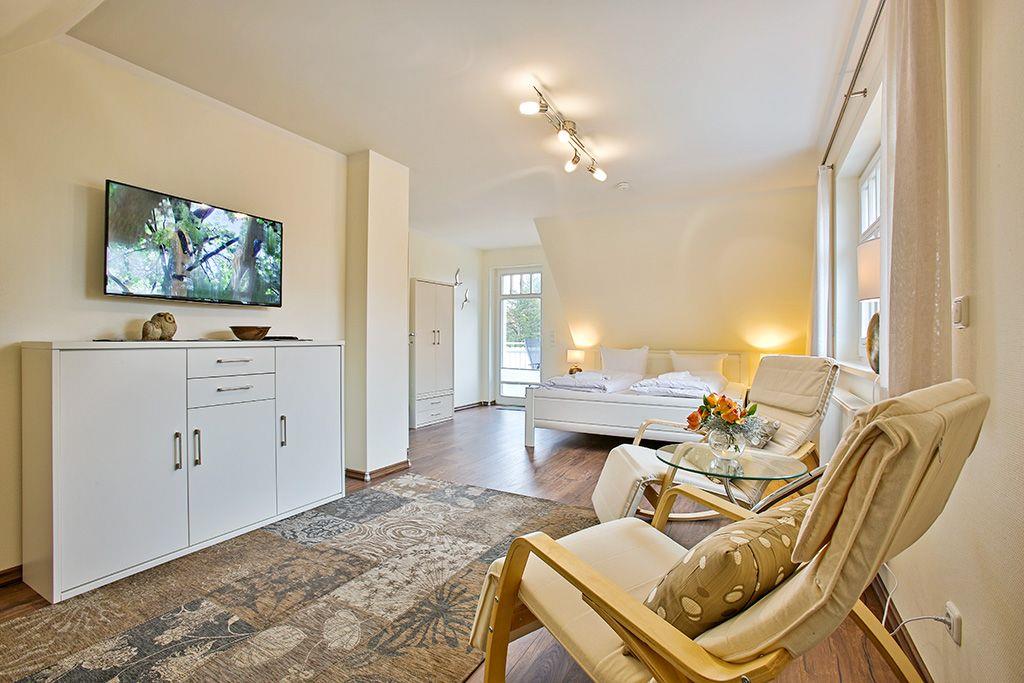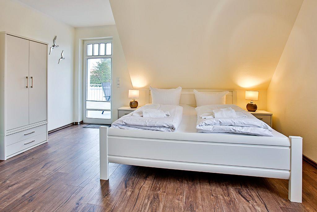 1 Schlafzimmer mit Doppelbett (1,80x2,00m, extra hoch), verstellbare Lattenroste, TV und Zugang zur Dachterrasse