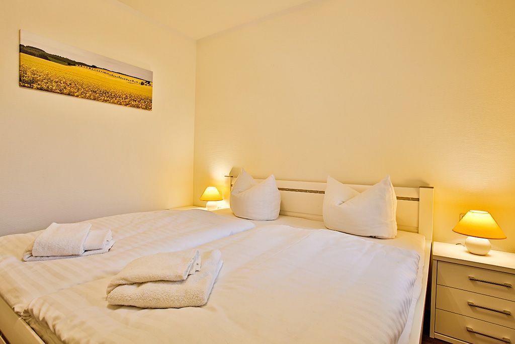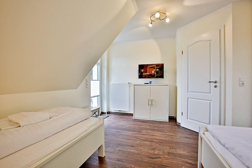 1 Schlafzimmer mit je 2 Einzelbetten (0,90x2,00m, extra hoch), verstellbare Lattenroste, TV und Zugang zur Dachterrasse