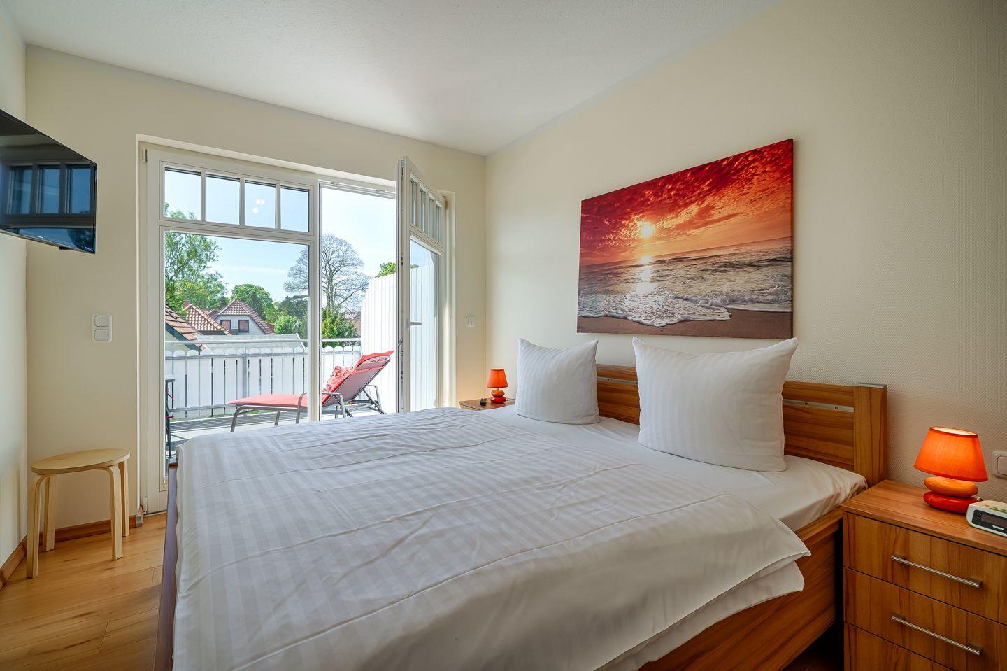 1 Schlafzimmer mit Doppelbett (1,80x2,00m), verstellbare Lattenroste, LCD-Sat-TV