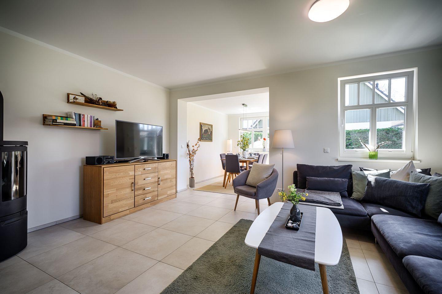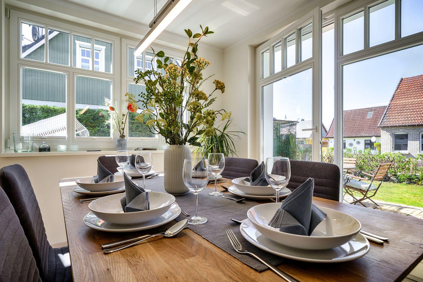 Wohnraum mit Couchgarnitur, Esstisch für 6 Personen im Wintergarten