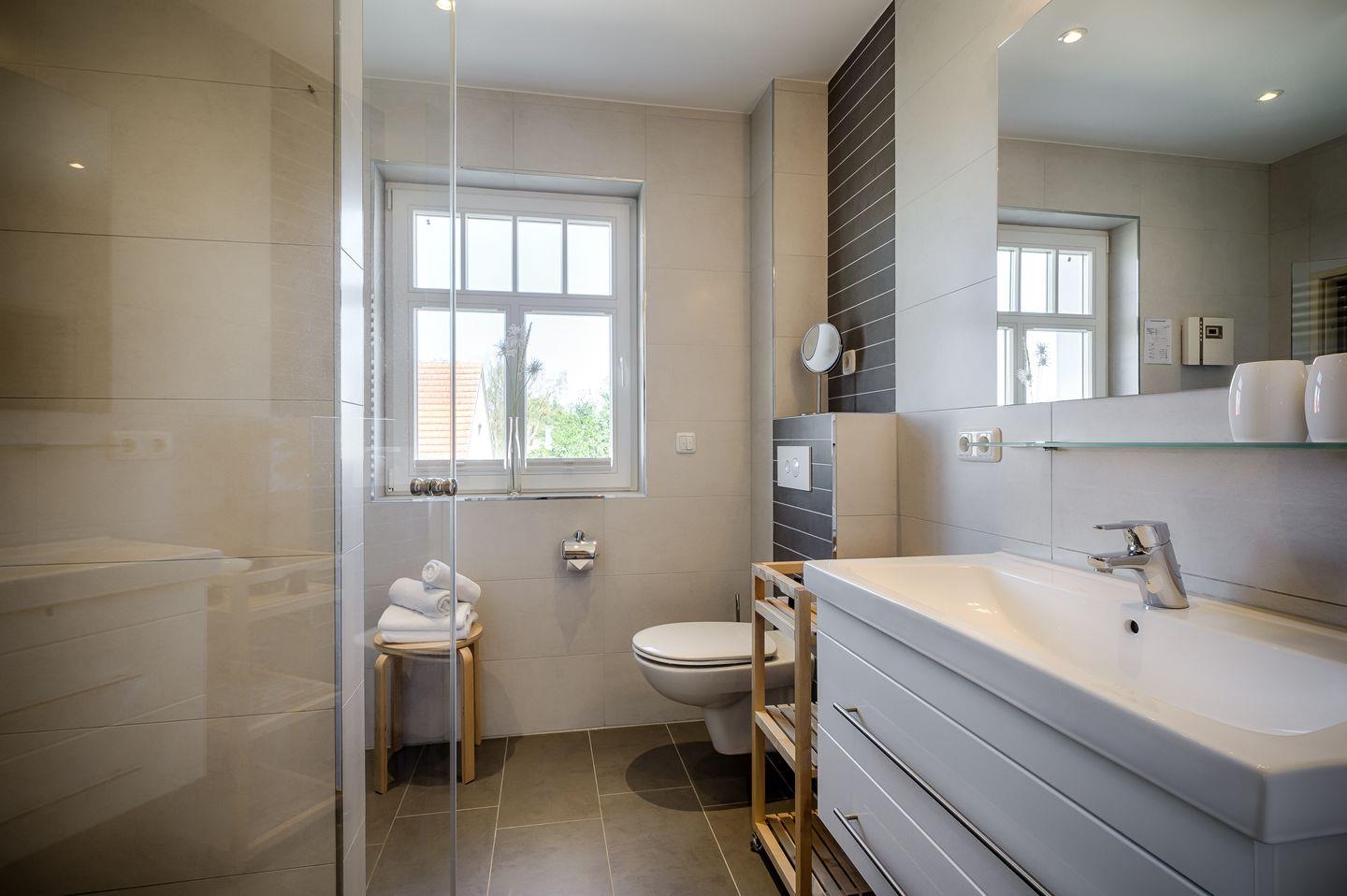 Bad mit ebenerdiger Dusche, anliegende Sauna (ohne Gebühren)