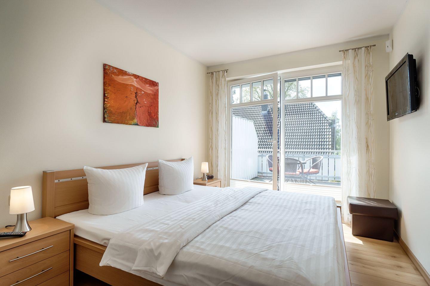 1 Schlafzimmer mit Doppelbett (1,80x2,00m), verstellbare Lattenroste, LCD-Sat-TV