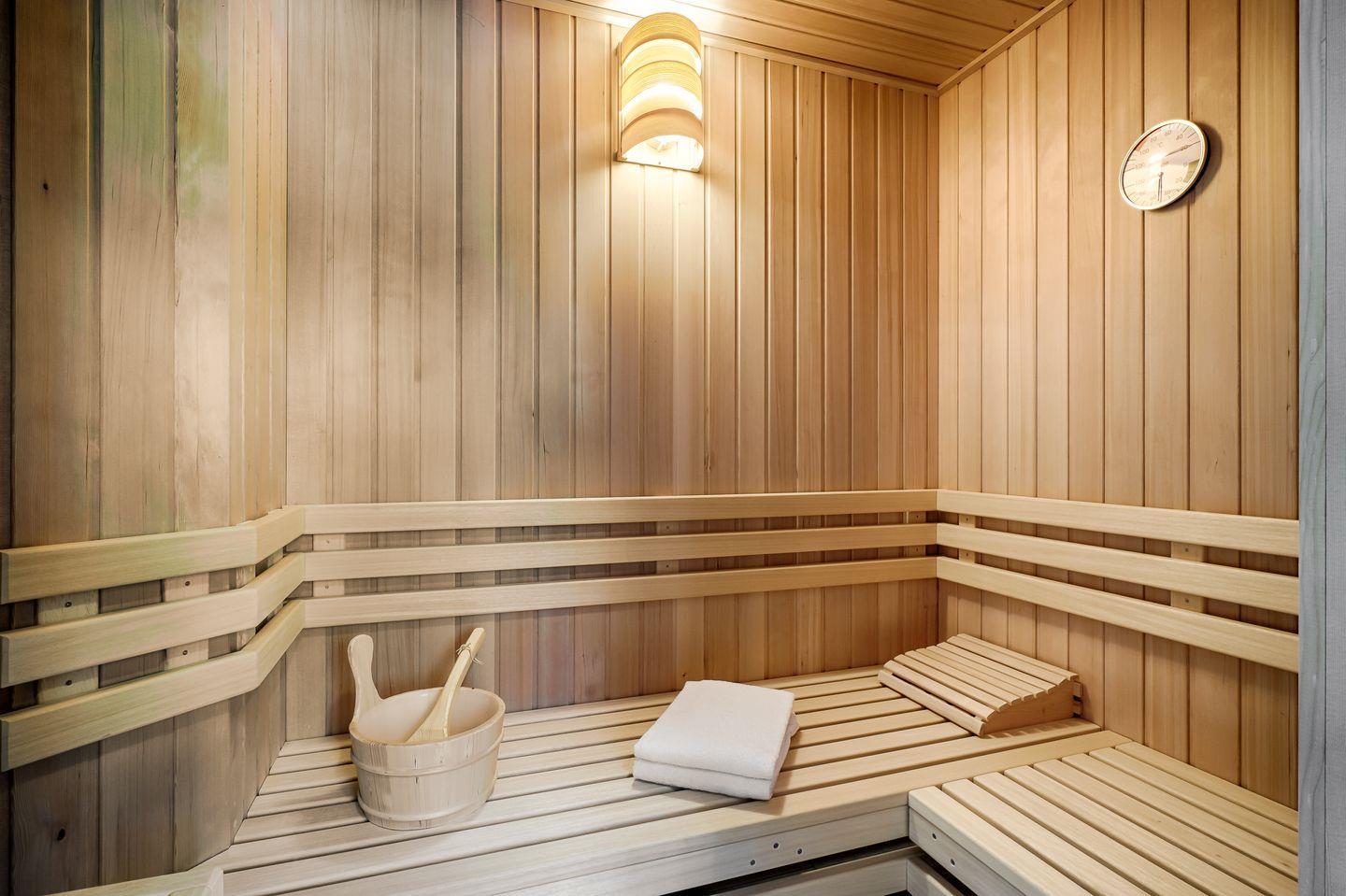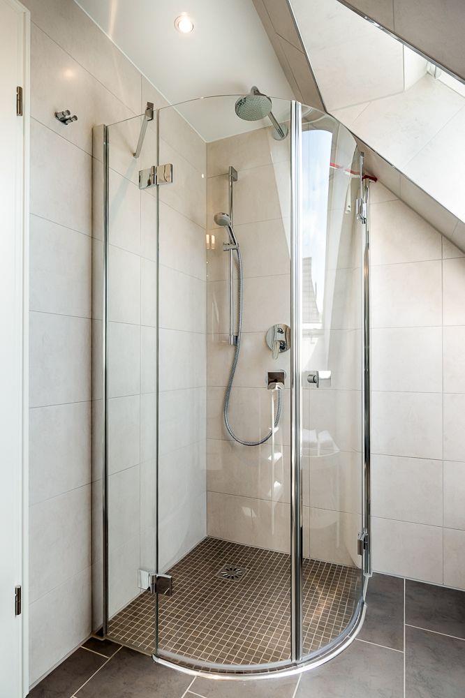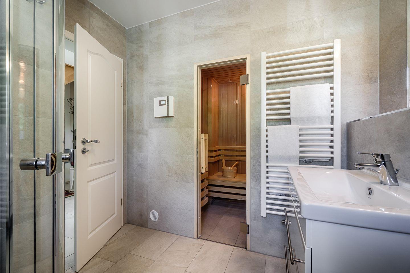 Bad mit ebenerdiger Dusche und anliegender Sauna