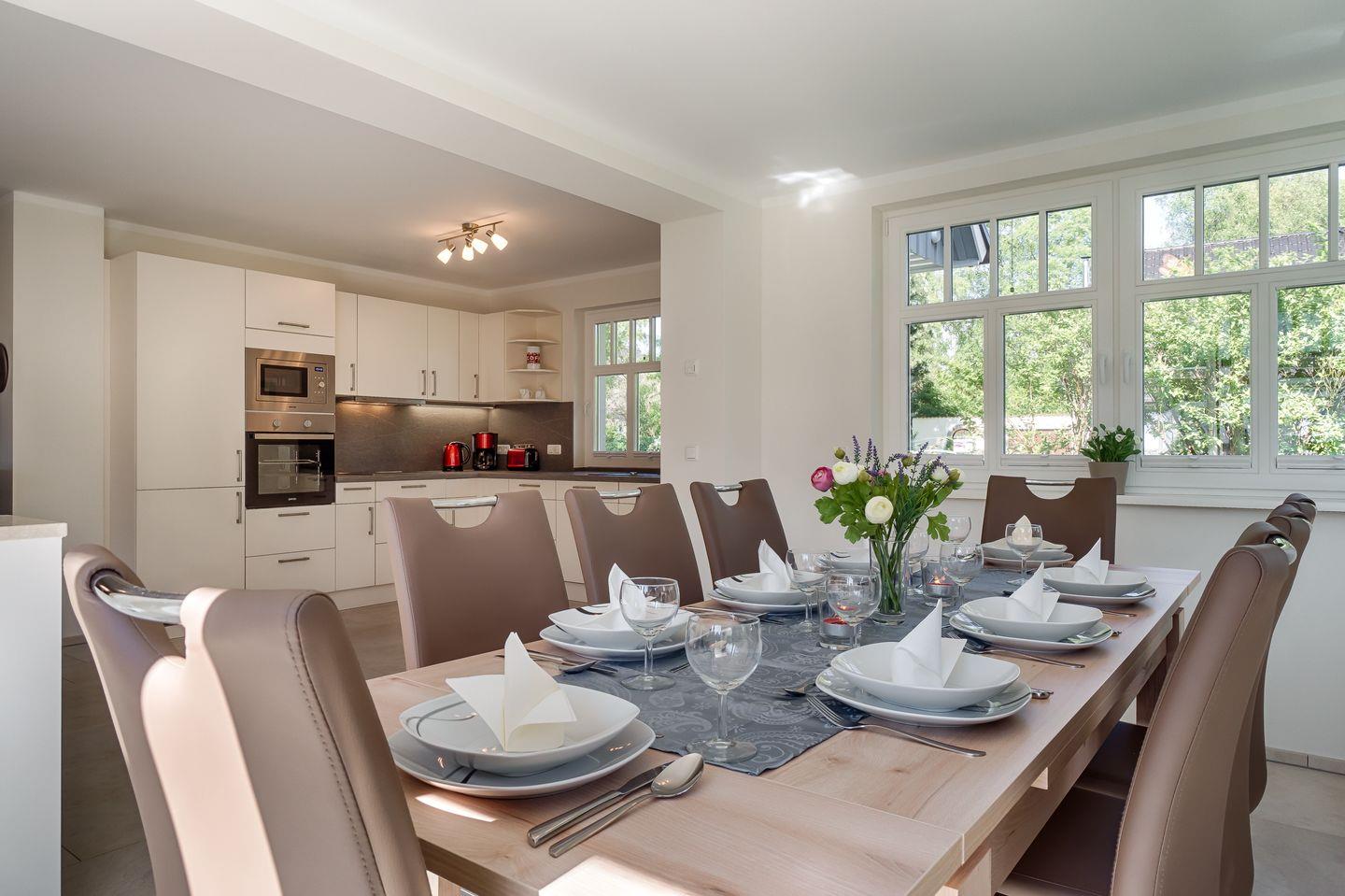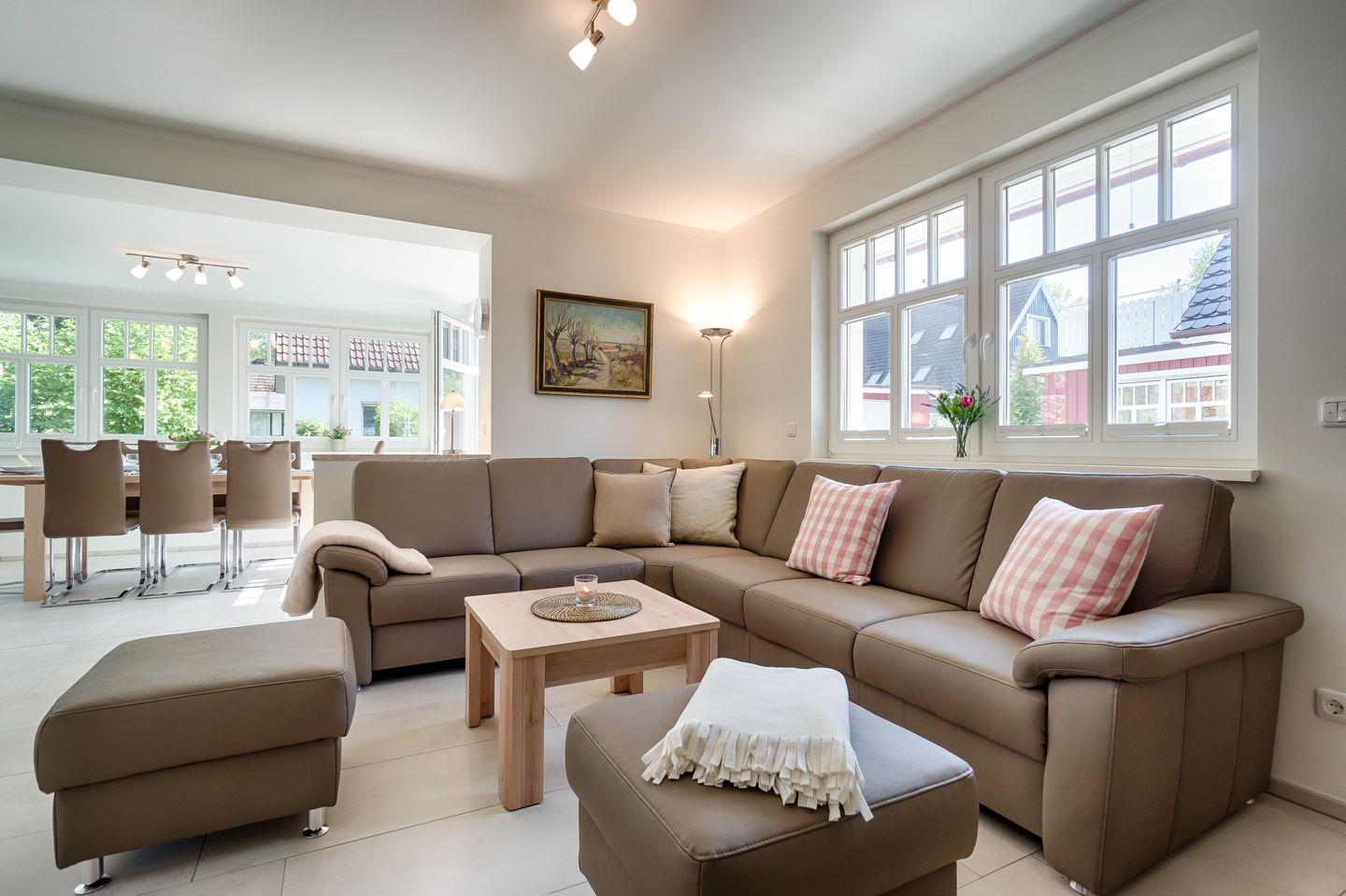 Wohnraum mit Ledercouch, Wintergarten mit Esstisch für 8 Personen