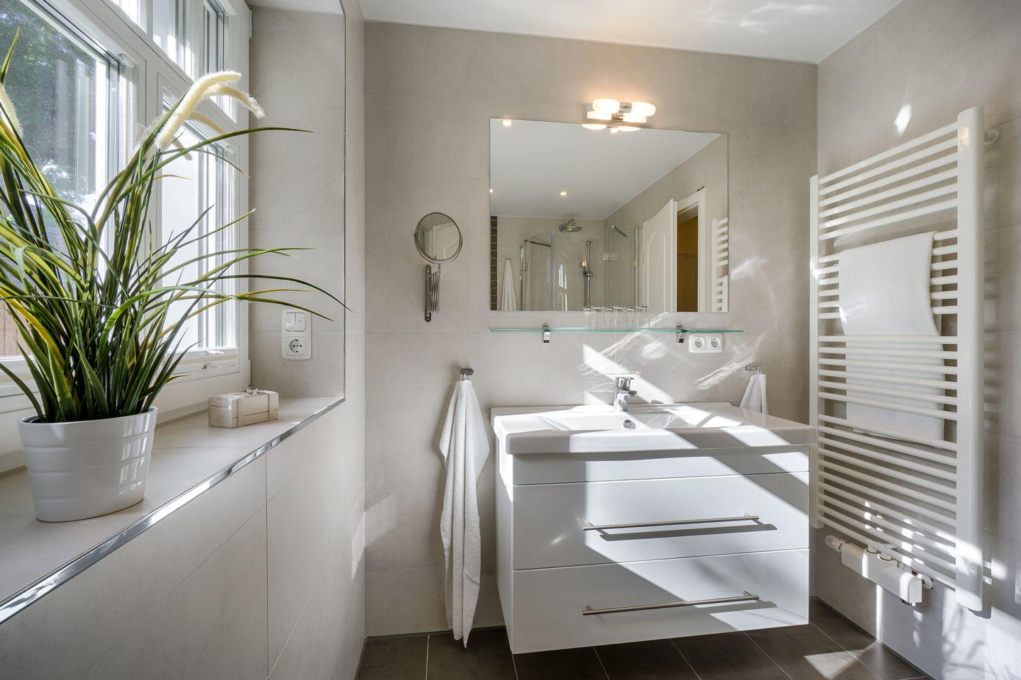 Badezimmer mit ebenerdiger Dusche und anliegender Sauna