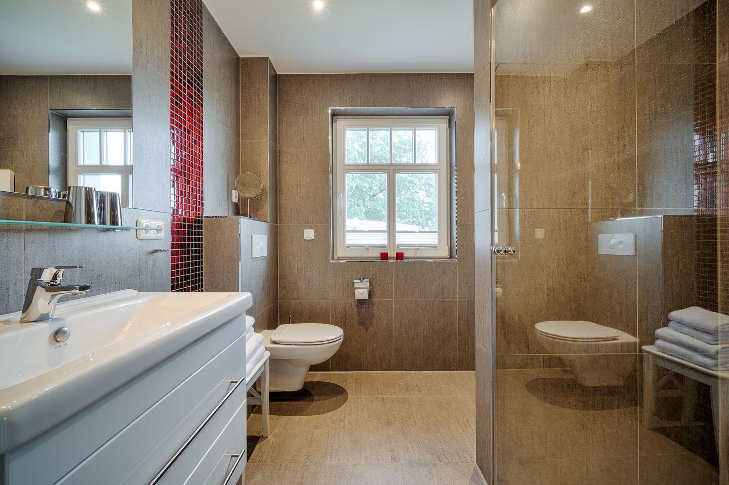 großes Bad mit ebenerdiger Dusche, Sauna (ohne Gebühren)