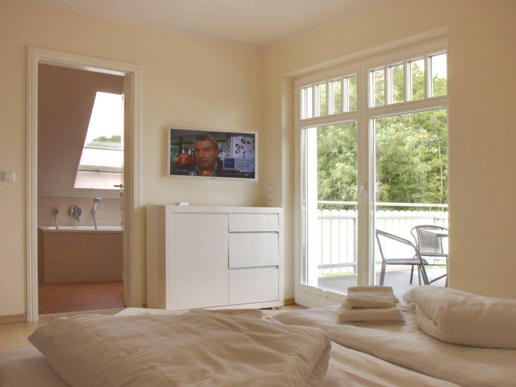 1 Schlafzimmer mit Doppelbett (1,80x2,00m), verstellbare Lattenroste, TV, eigenes Bad mit Wanne/ebenerdiger Dusche
