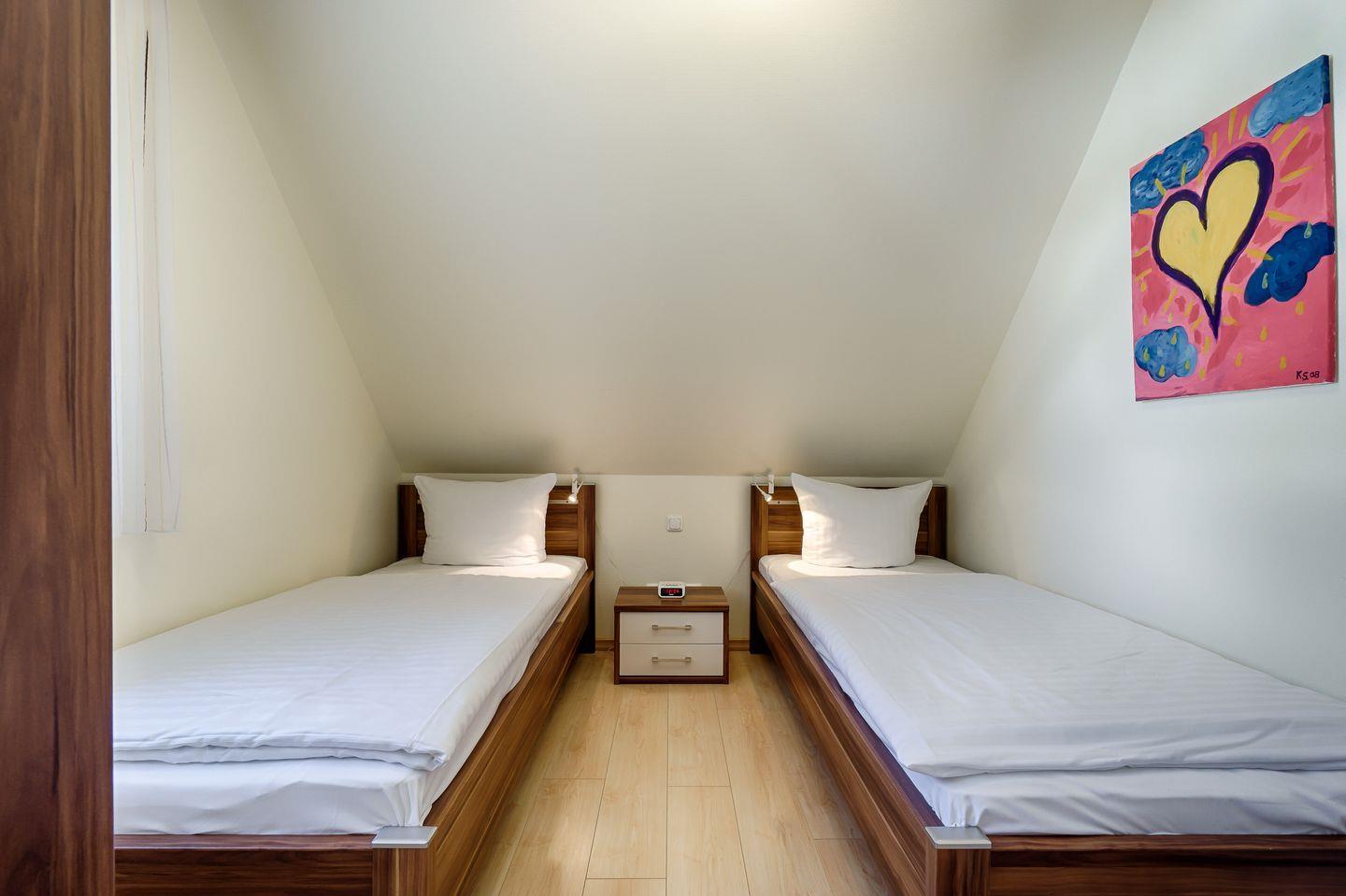 1 Schlafzimmer (Durchgangszimmer) mit 2 Einzelbetten, verstellbare Lattenroste, Zugang zum Bad mit ebenerdiger Dusche (hat auch Zugang vom Flur aus)