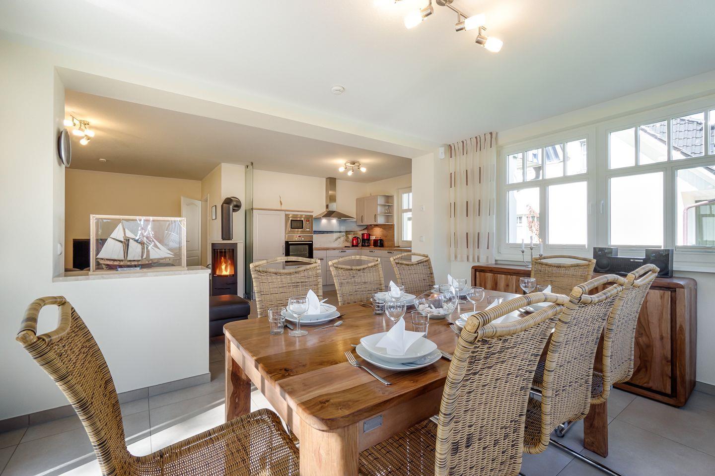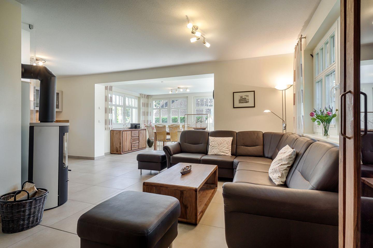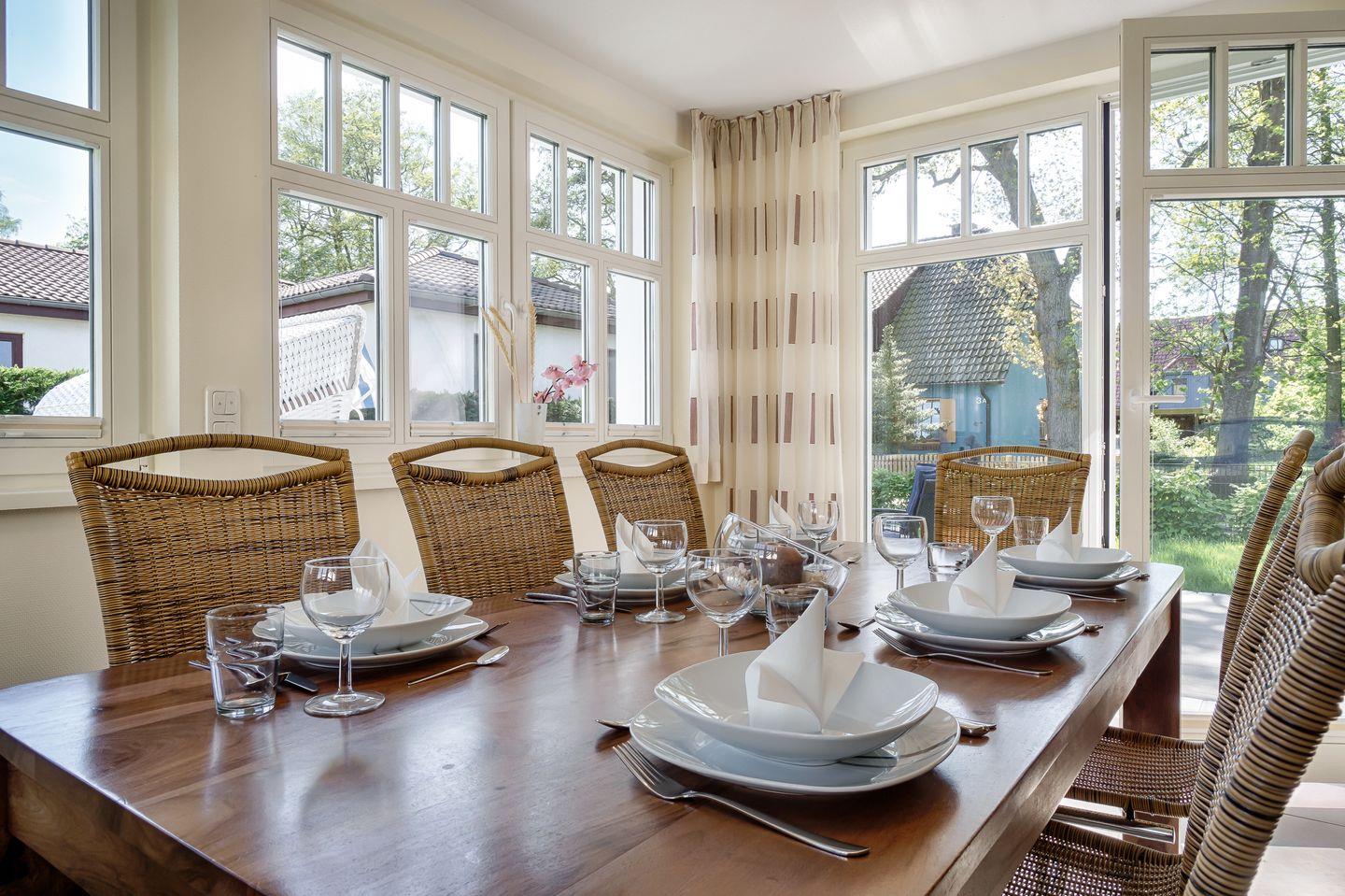Wohnraum mit Ledercouch, Wintergarten mit Esstisch für 8 Personen