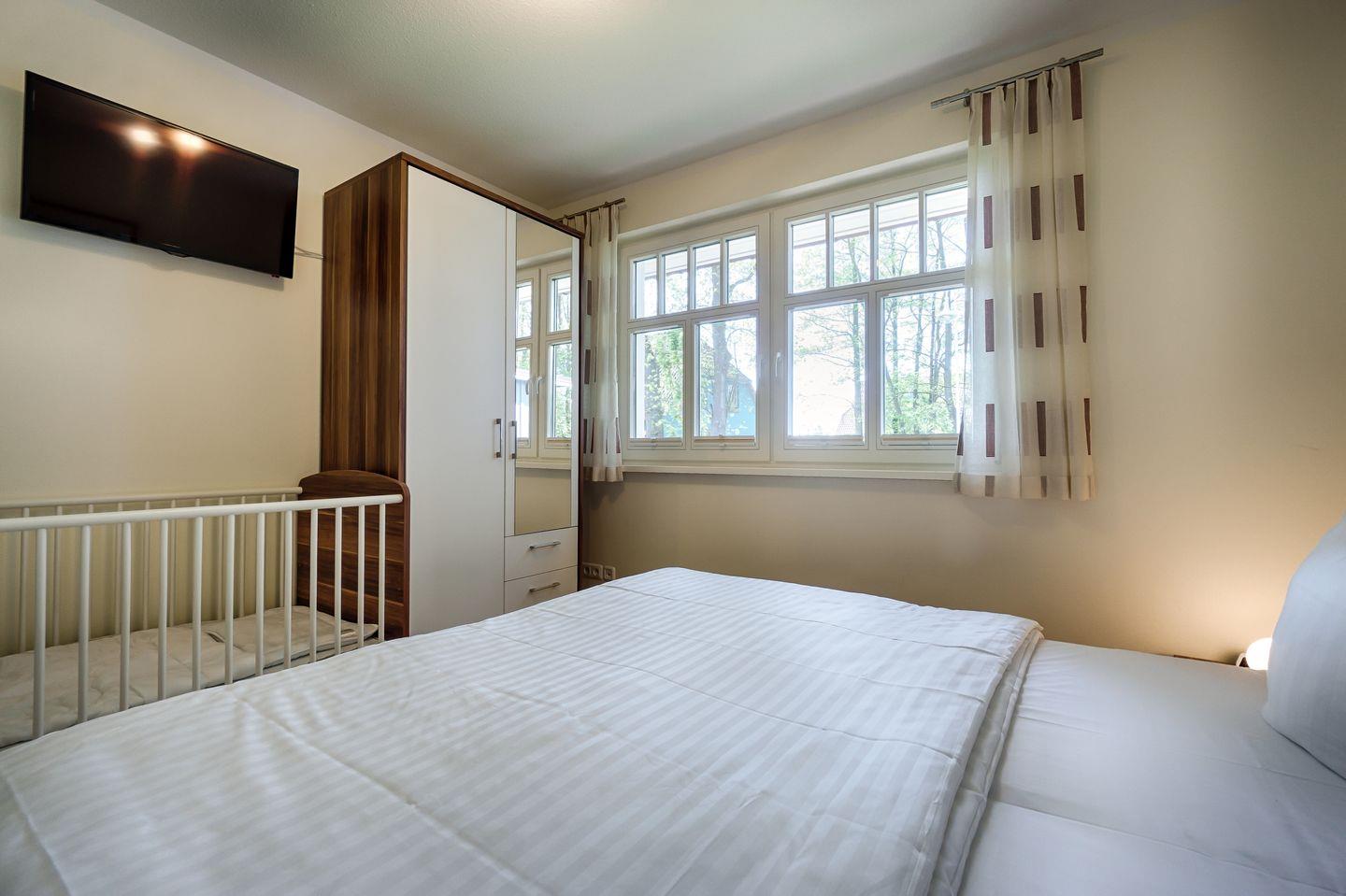 1 Schlafzimmer Doppelbett (1,80x2,00m), verstellbare Lattenroste, Kindergitterbett