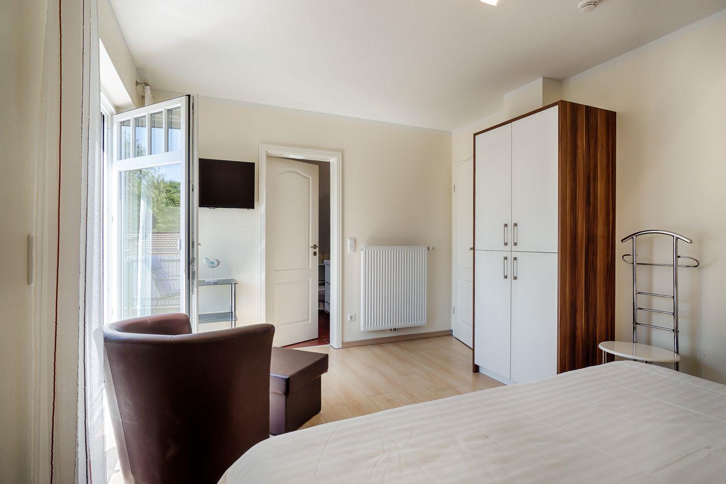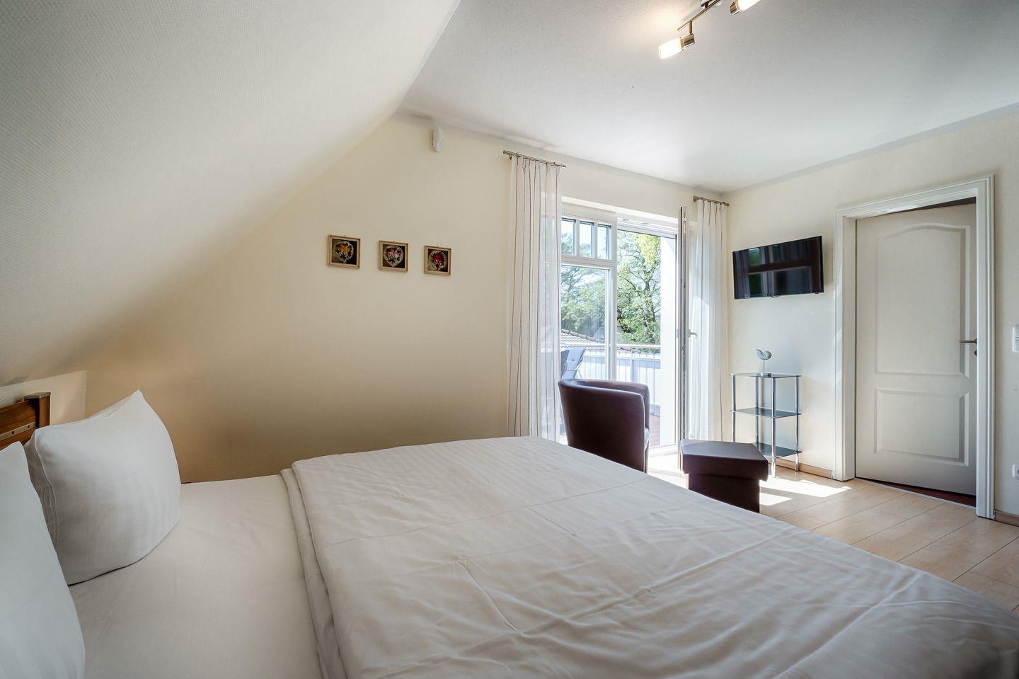 1 Schlafzimmer mit Doppelbett (1,80x2,00m), verstellbare Lattenroste, TV, eigenes Bad mit ebenerdiger Dusche