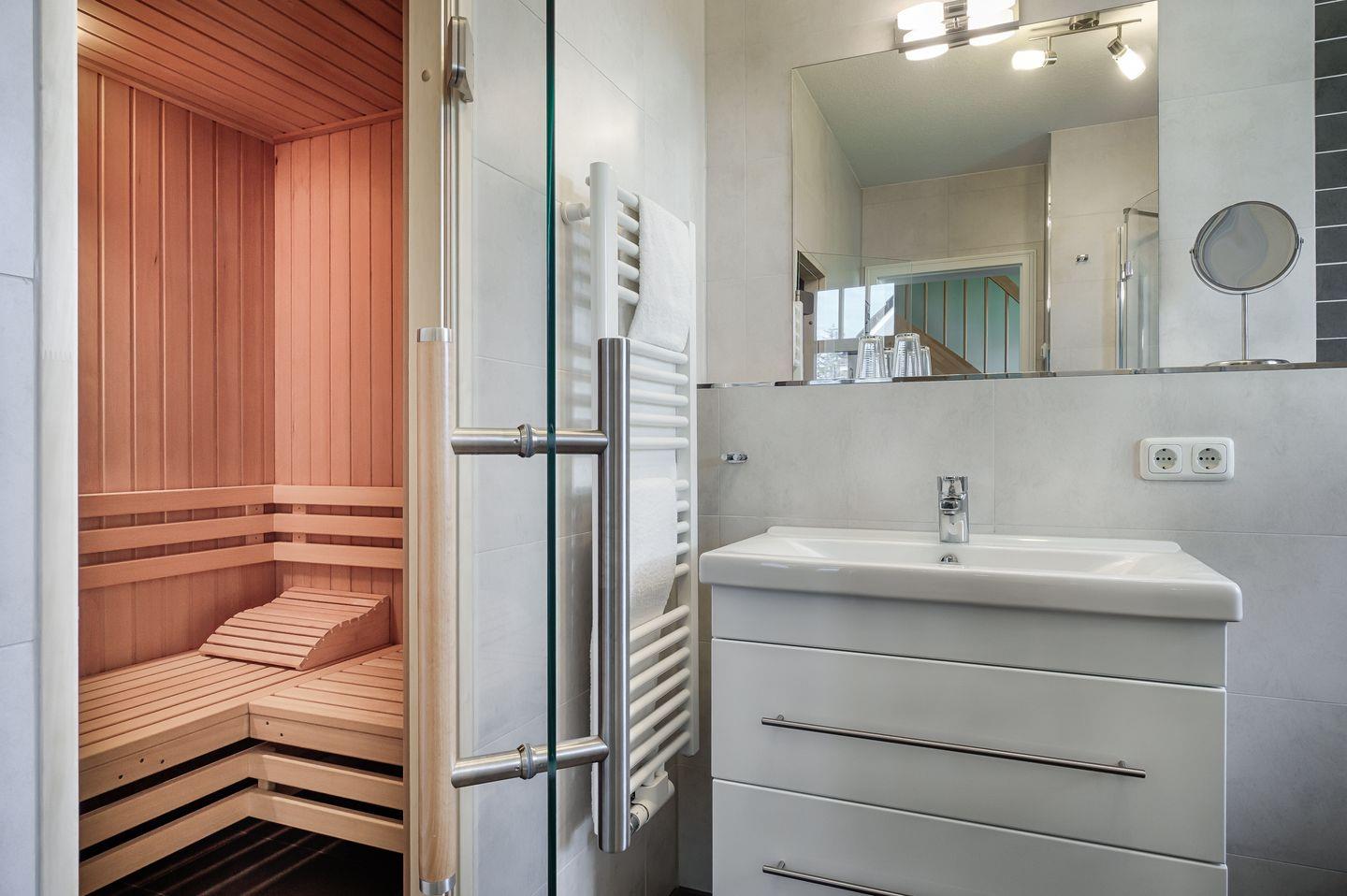 Bad mit ebenerdiger Dusche, anliegender Münzsauna (2,00€ /Std.)