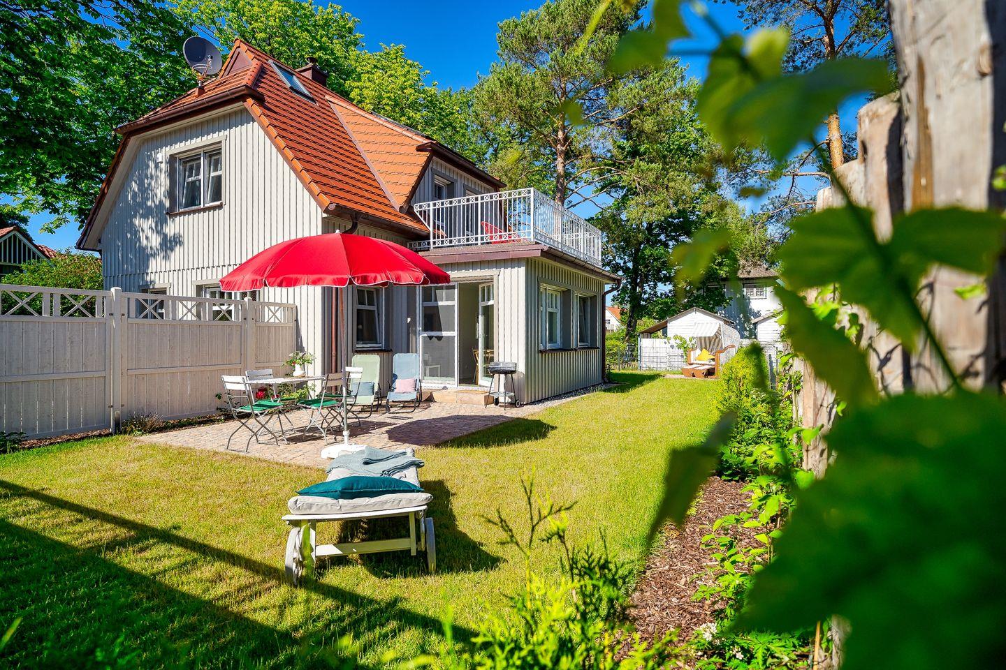 Terrasse in Süd-Südwestausrichtung mit Gartenmöbeln, Sonnenschirm, Garten, 2 Kipp- und 1 Liege mit Auflage, Holzkohlegrill, Strandkorb (Mai-Oktober)