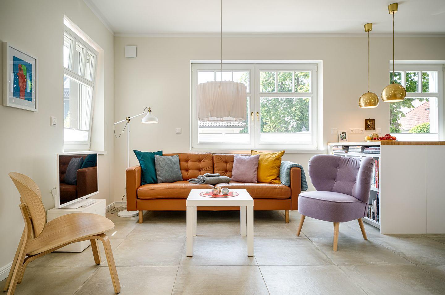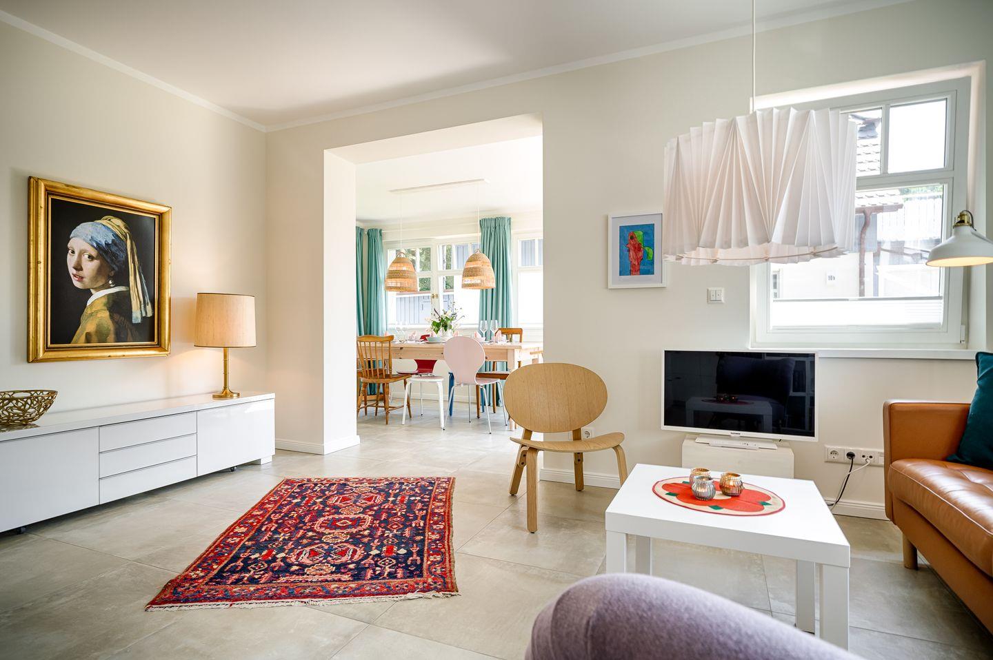 Wohnraum mit Sofa und Sessel, TV, Bücherregal, Kommode mit Gesellschaftsspielen