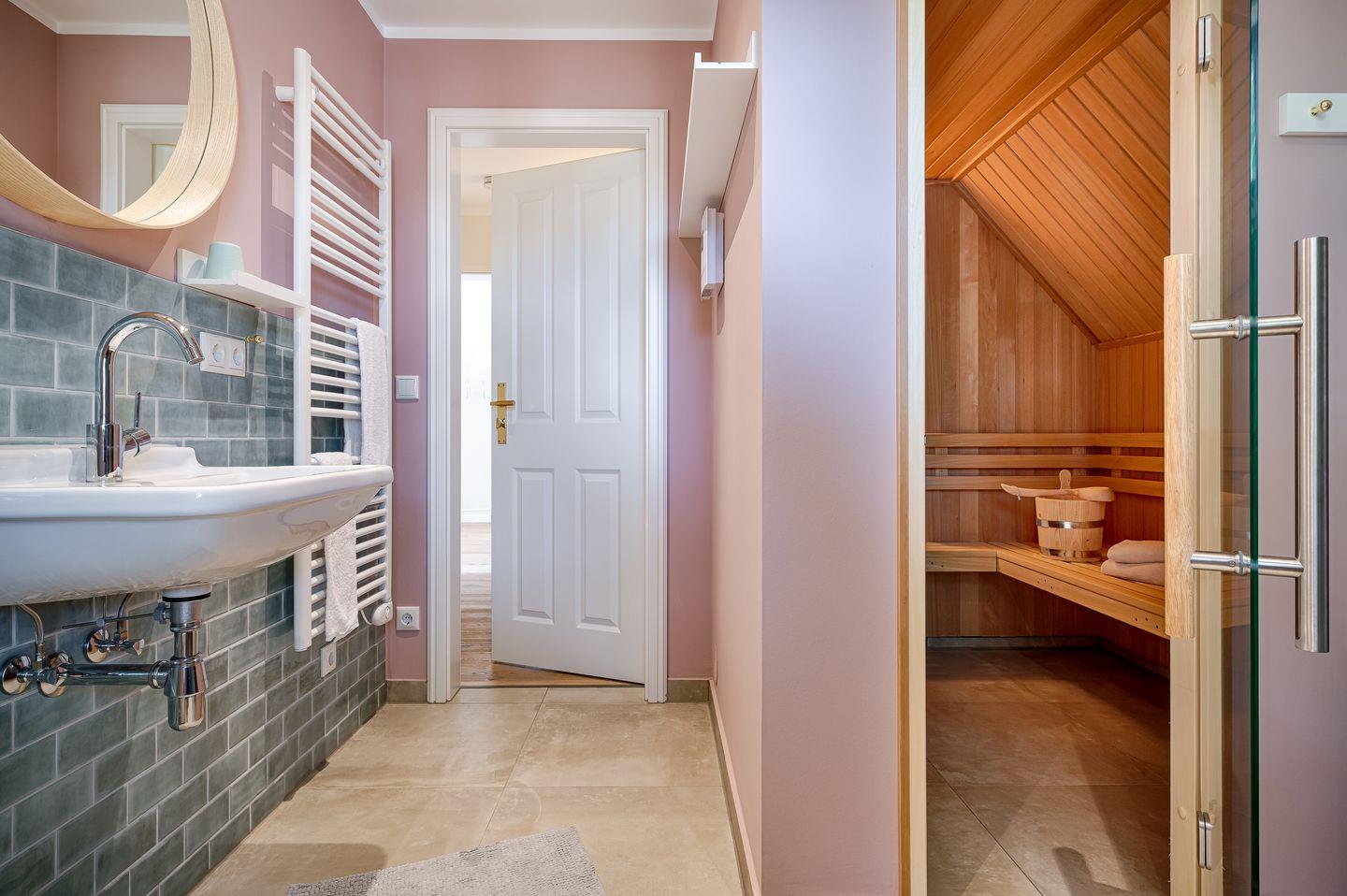 Bad mit ebenerdiger DU/WC, Waschmaschine (ohne Gebühren), anliegender Sauna (ohne Gebühren)