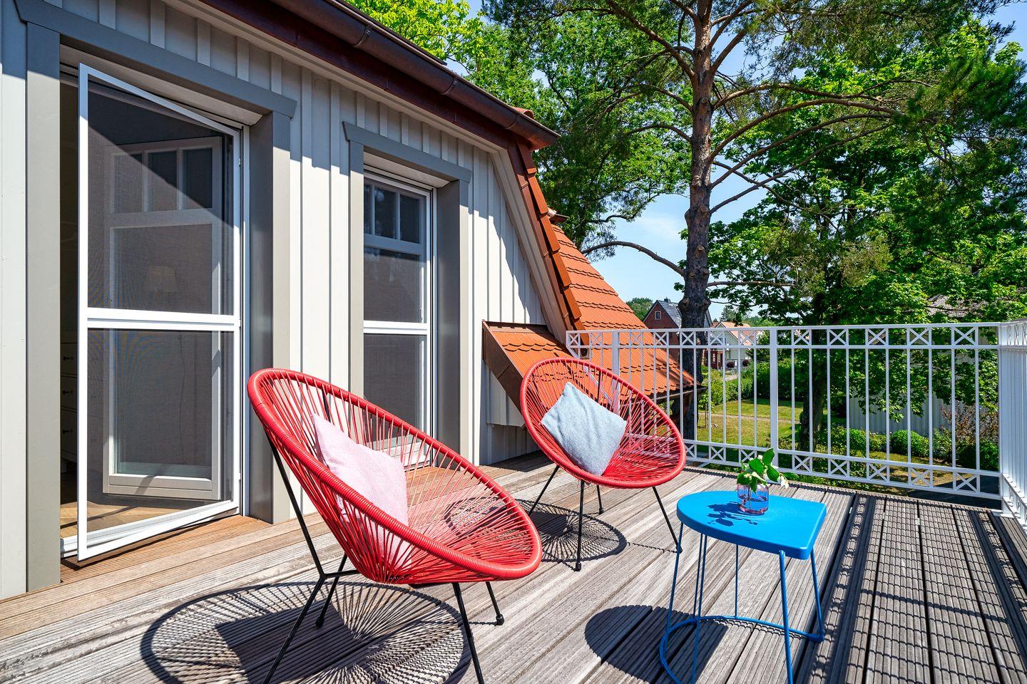 Zugang vom Schlafzimmer zur Dachterrasse nach Süden mit Terrassenmöbeln