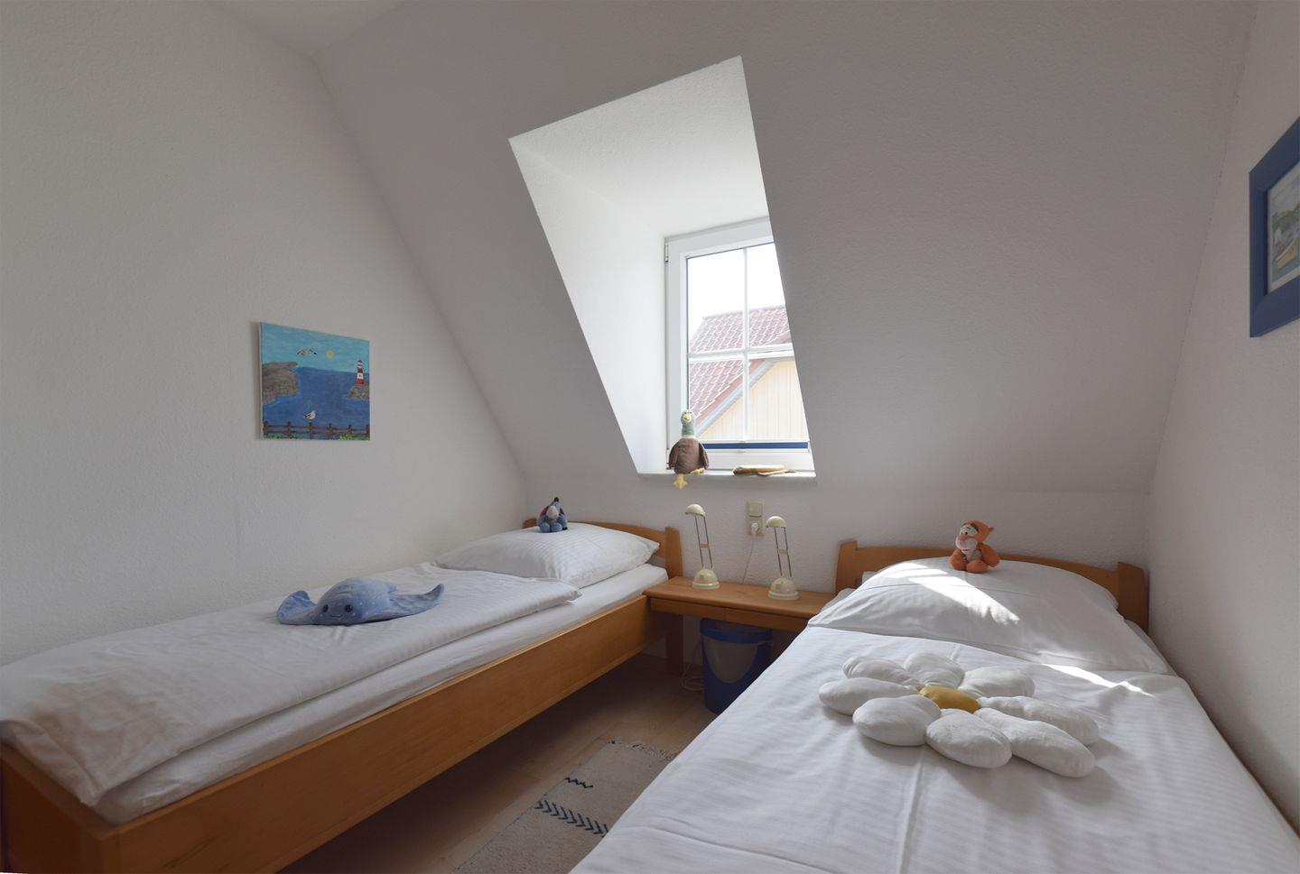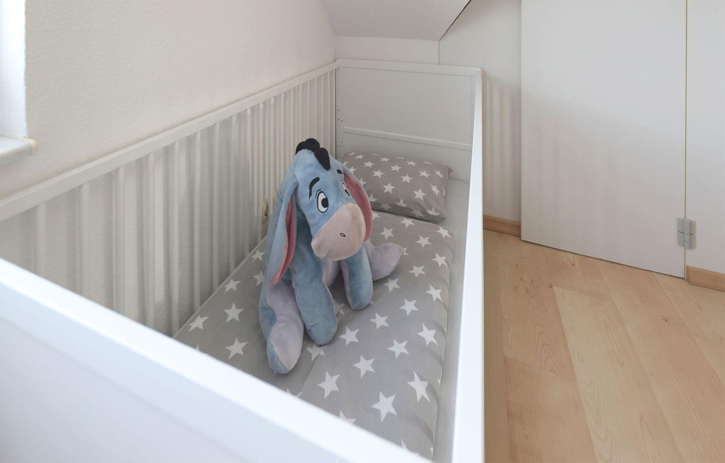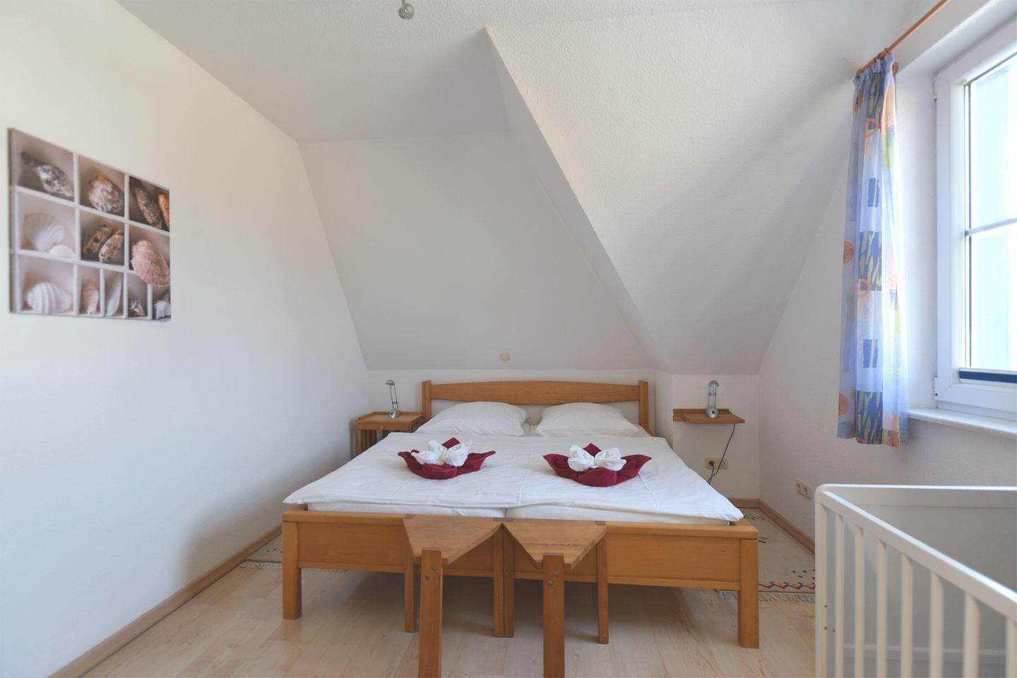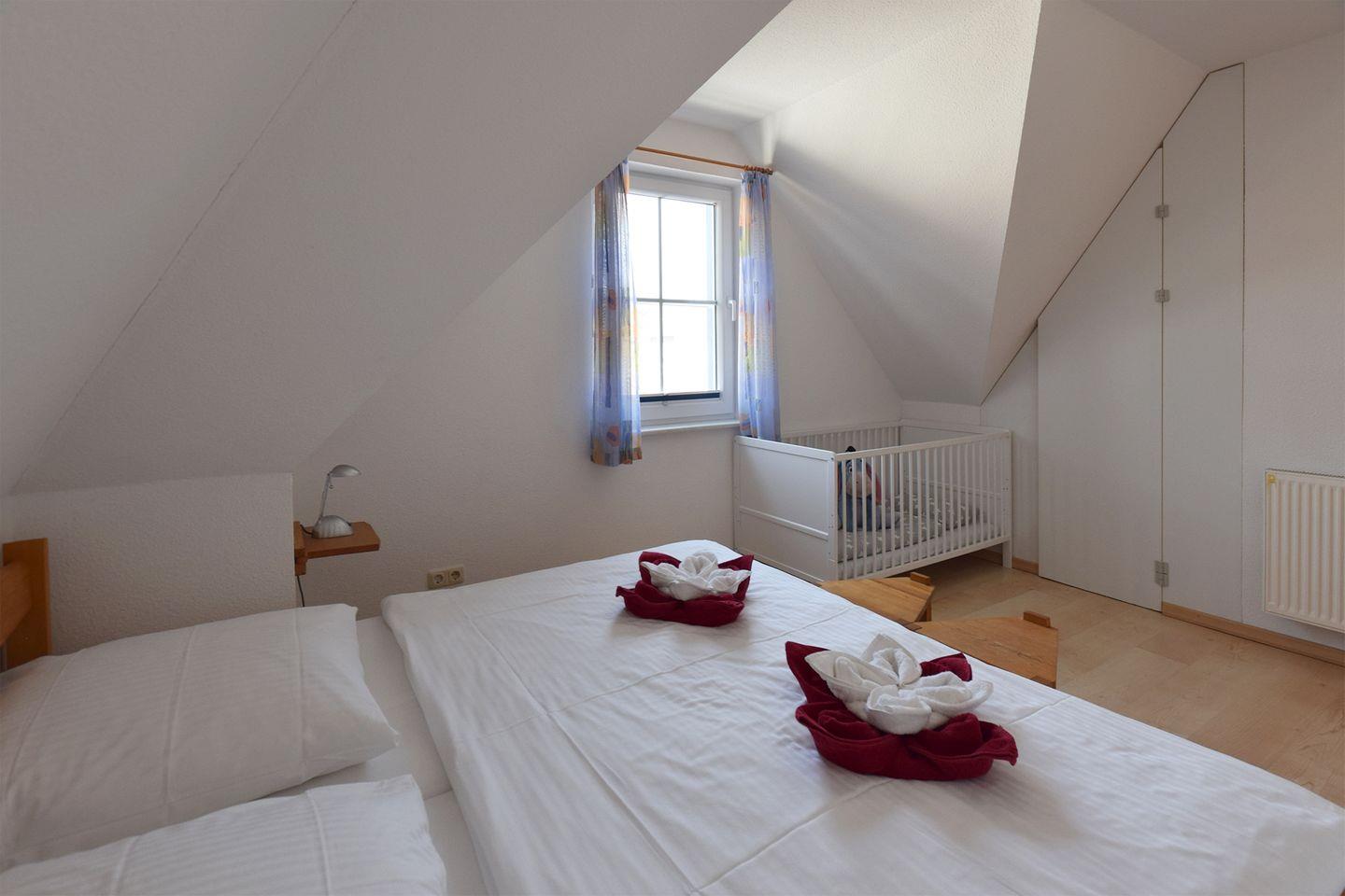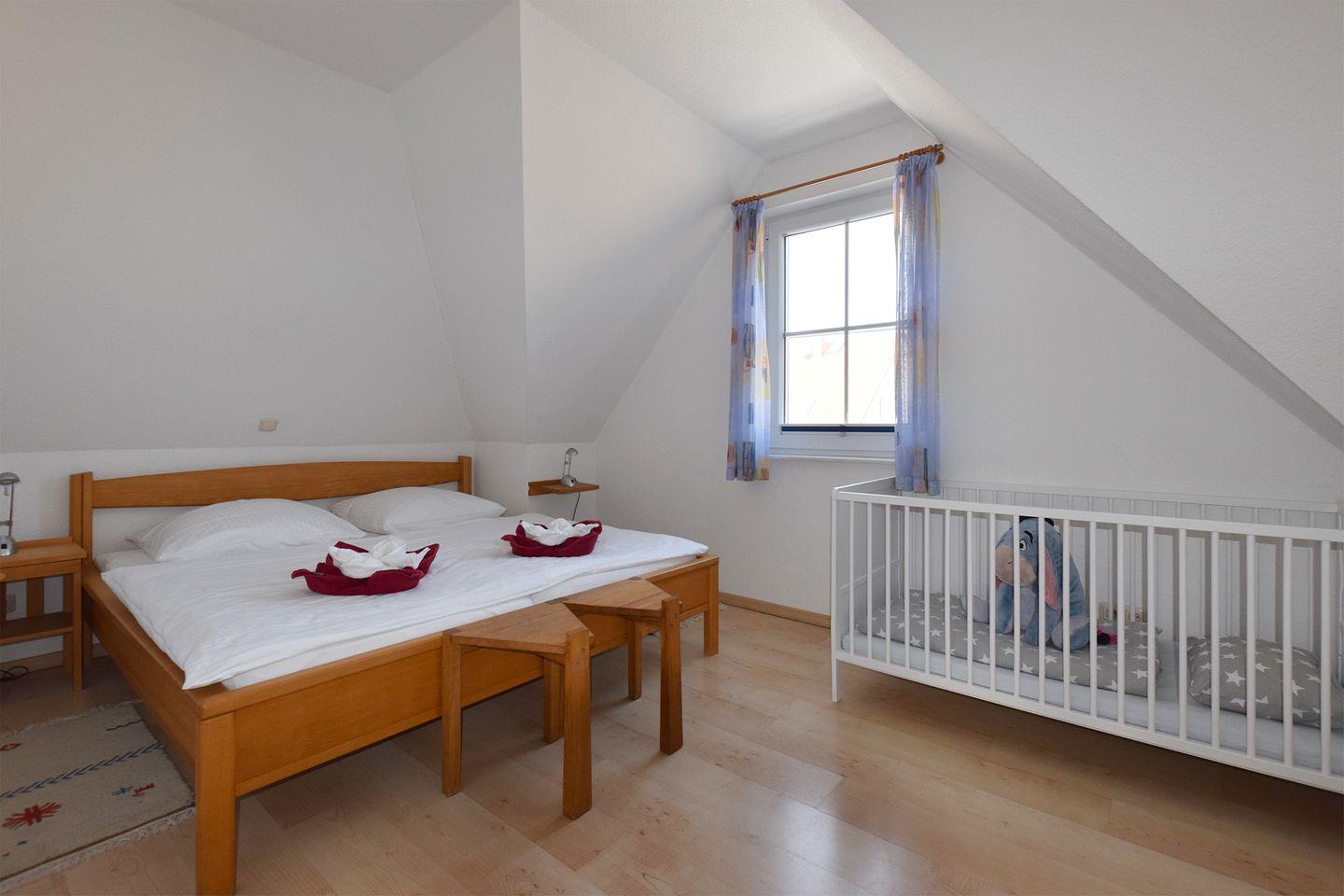 Die Ferienwohnung verfügt über zwei Schlafzimmer: eines mit einem Doppelbett (180 x 200 cm) und eines mit zwei Einzelbetten (90 x 200 cm). Das Badezimmer ist mit einer Dusche und einem WC ausgestattet. Eine Waschmaschine sorgt für zusätzlichen Komfort. Für die kleineren Gäste stehen ein Kinderbett und ein Kinderhochstuhl zur Verfügung.