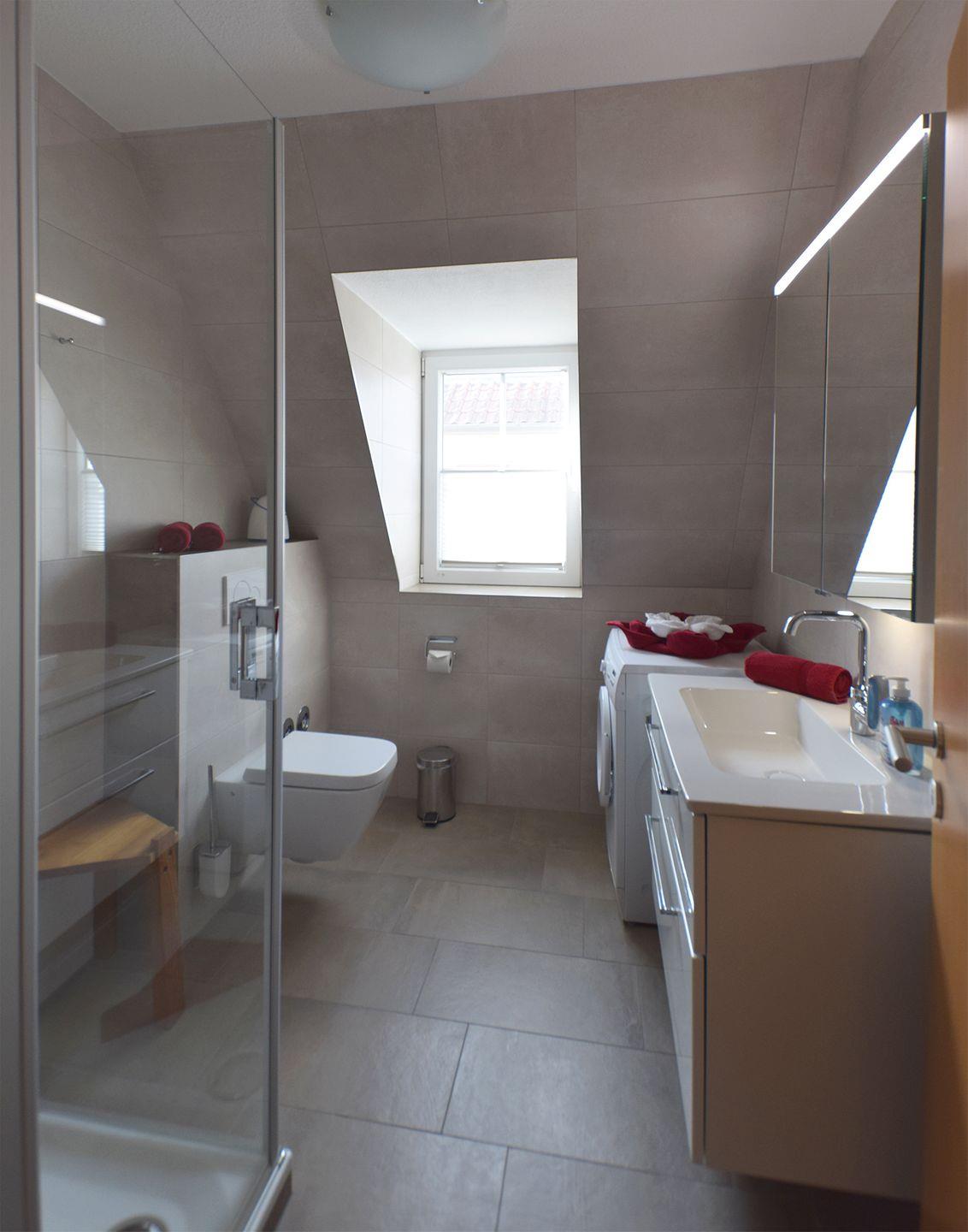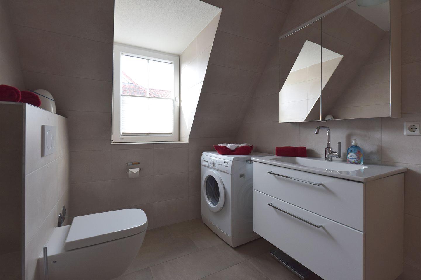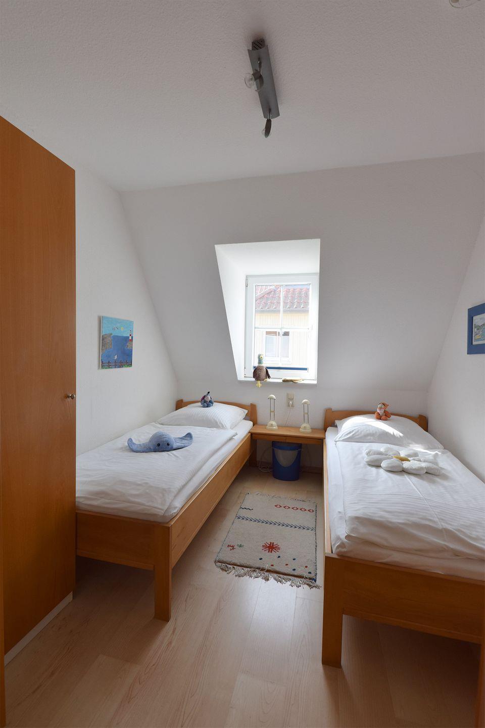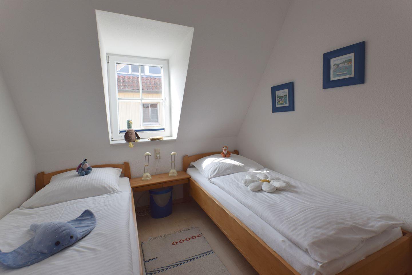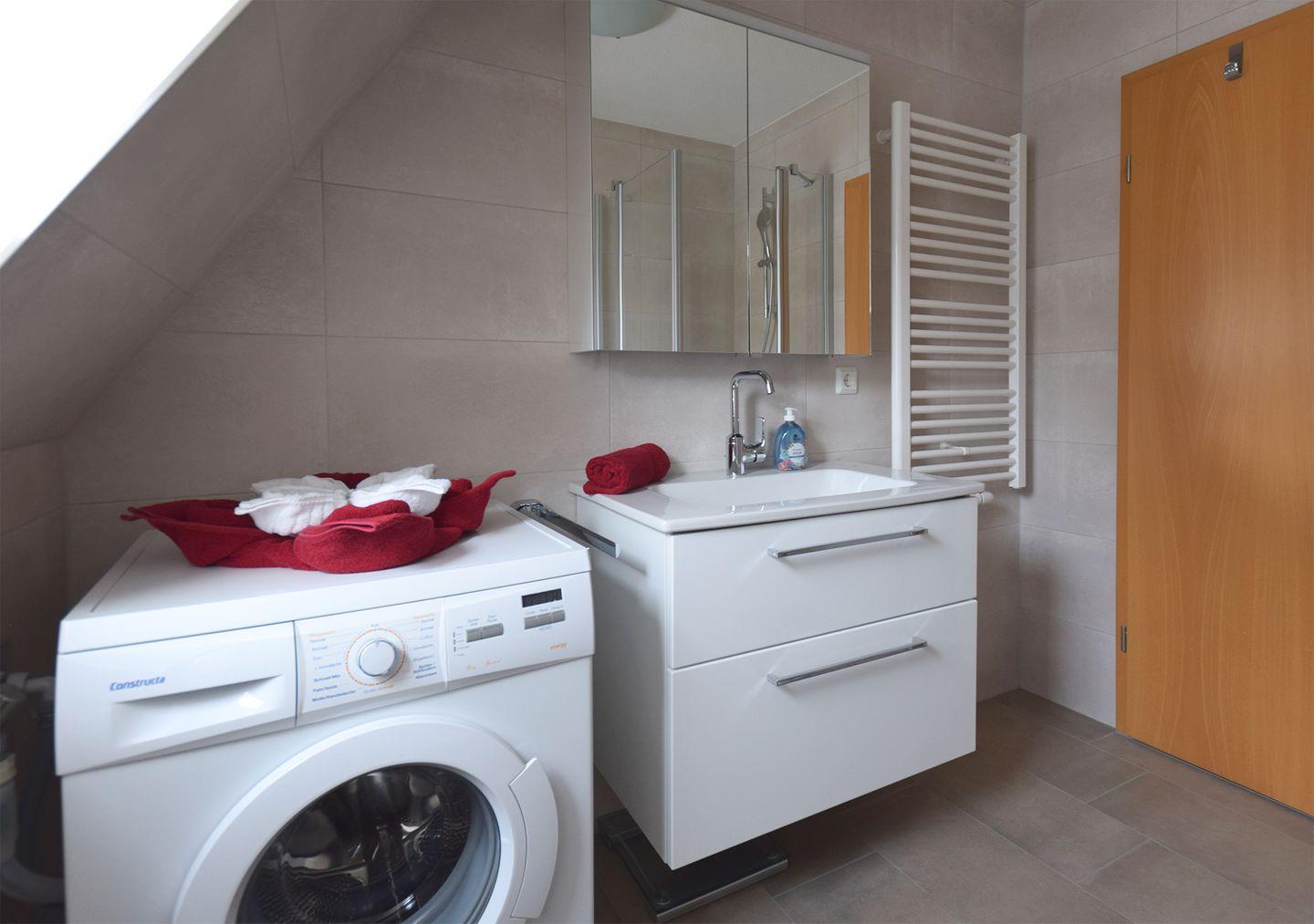 Die Ferienwohnung verfügt über zwei Schlafzimmer: eines mit einem Doppelbett (180 x 200 cm) und eines mit zwei Einzelbetten (90 x 200 cm). Das Badezimmer ist mit einer Dusche und einem WC ausgestattet. Eine Waschmaschine sorgt für zusätzlichen Komfort. Für die kleineren Gäste stehen ein Kinderbett und ein Kinderhochstuhl zur Verfügung.