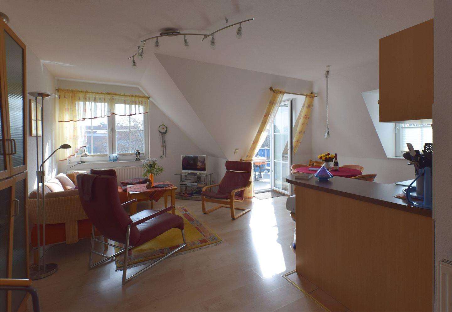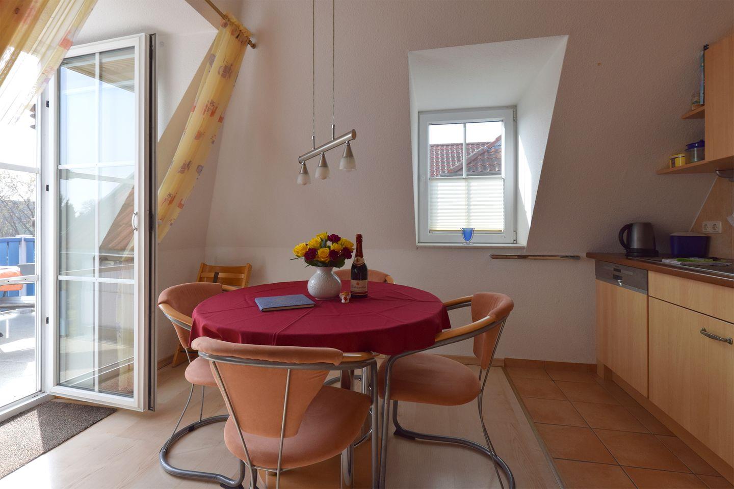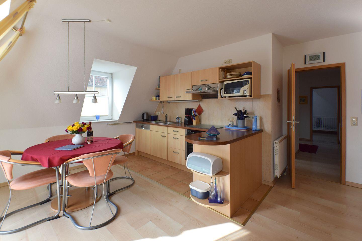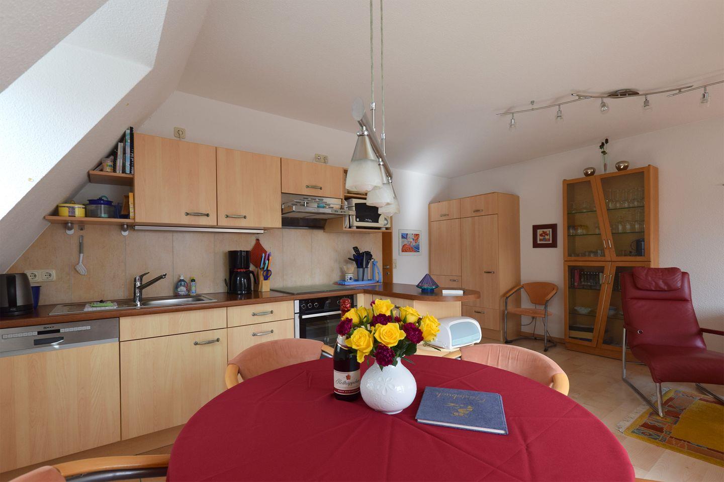 Diese gemütliche Ferienwohnung für bis zu 4 Personen befindet sich im Obergeschoss und bietet auf ca. 60 m² eine komfortable und gut ausgestattete Unterkunft. Der Wohnbereich ist mit einer Sitzgarnitur, einem Esstisch, TV (SAT/Kabel) und einem Radio mit CD/DVD-Player ausgestattet, sodass Sie entspannte Stunden genießen können. Die moderne Küchenzeile bietet mit einem Induktionsherd, Backofen, Geschirrspüler, Mikrowelle, Kühlschrank mit Gefrierfach, Kaffeemaschine, Toaster und Wasserkocher alles, was Sie für die