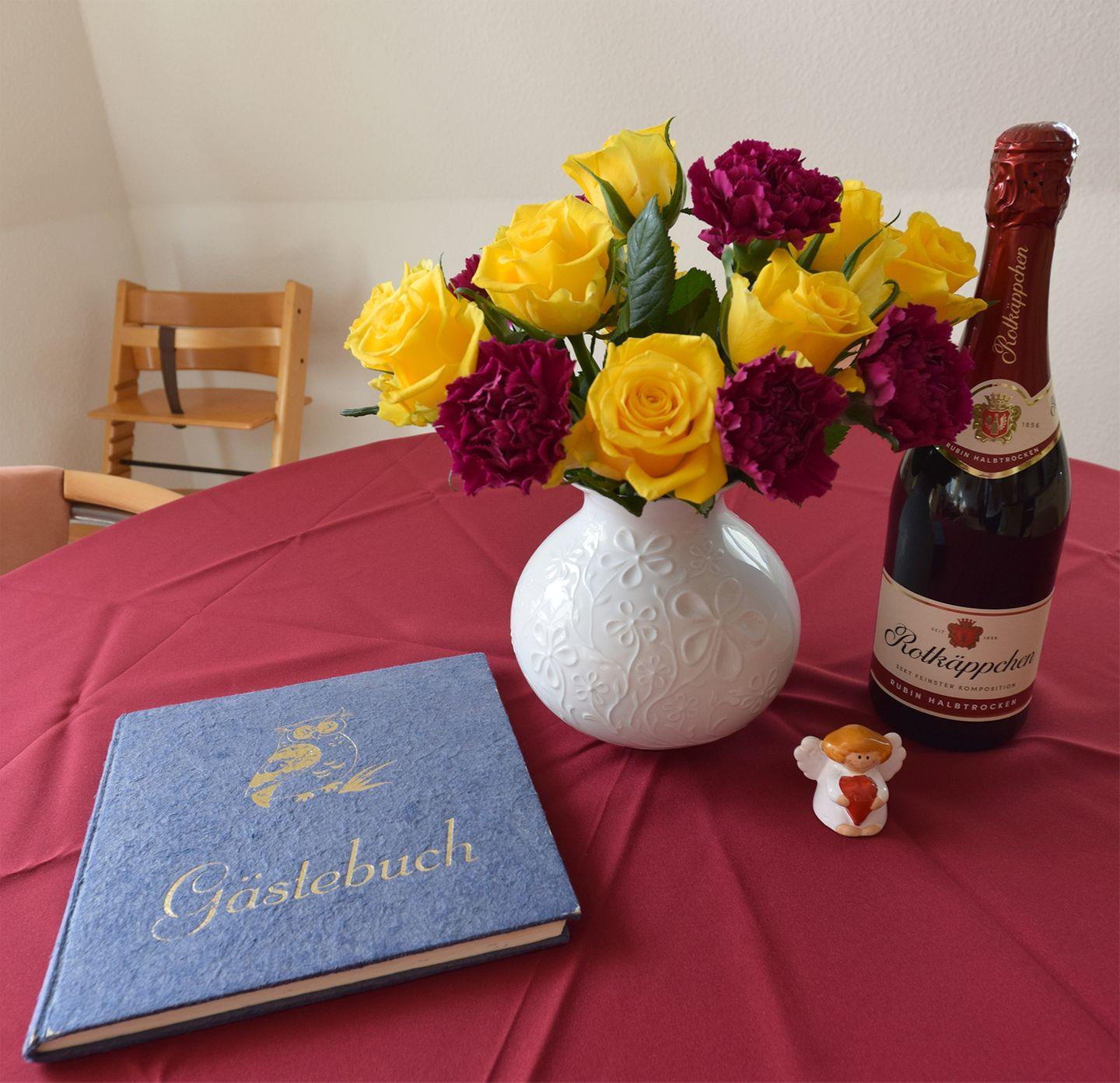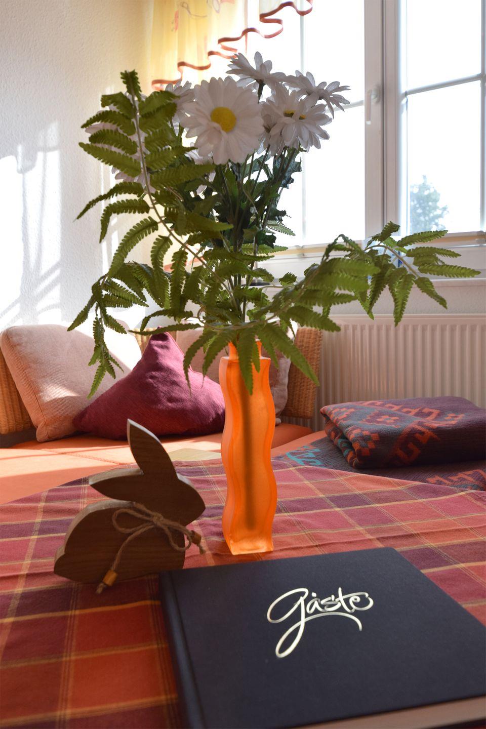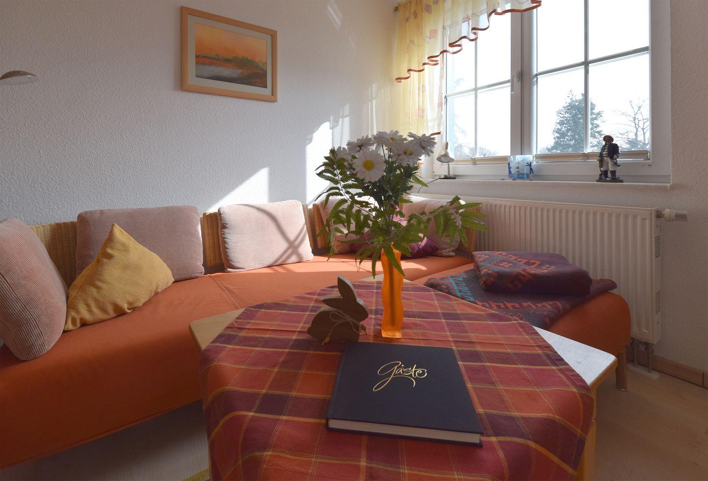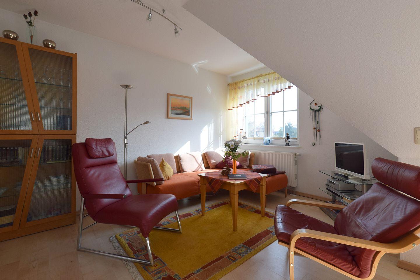 Diese gemütliche Ferienwohnung für bis zu 4 Personen befindet sich im Obergeschoss und bietet auf ca. 60 m² eine komfortable und gut ausgestattete Unterkunft. Der Wohnbereich ist mit einer Sitzgarnitur, einem Esstisch, TV (SAT/Kabel) und einem Radio mit CD/DVD-Player ausgestattet, sodass Sie entspannte Stunden genießen können. Die moderne Küchenzeile bietet mit einem Induktionsherd, Backofen, Geschirrspüler, Mikrowelle, Kühlschrank mit Gefrierfach, Kaffeemaschine, Toaster und Wasserkocher alles, was Sie für die