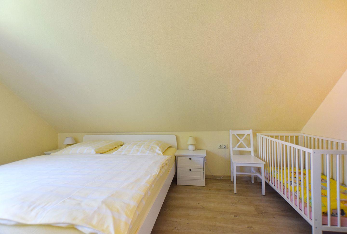 Im Obergeschoss befinden sich zwei Schlafzimmer: ein Schlafzimmer mit Doppelbett (180 x 200 cm) und ein weiteres mit zwei Einzelbetten (90 x 200 cm). Für kleine Gäste stehen ein Babygitterbett und ein Kinderhochstuhl zur Verfügung. Bettwäsche und 2 Handtücher pro Person sind ab 7 Übernachtungen ebenfalls inklusive. Außerdem genießen Sie eine Terrasse zum Entspannen und einen eigenen Parkplatz direkt am Haus.