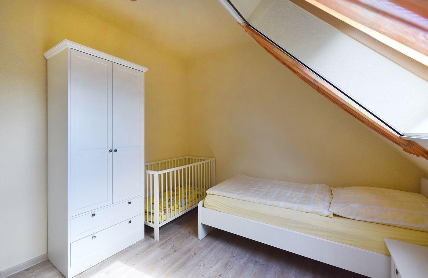 Im Obergeschoss befinden sich zwei Schlafzimmer: ein Schlafzimmer mit Doppelbett (180 x 200 cm) und ein weiteres mit zwei Einzelbetten (90 x 200 cm). Für kleine Gäste stehen ein Babygitterbett und ein Kinderhochstuhl zur Verfügung. Bettwäsche und 2 Handtücher pro Person sind ab 7 Übernachtungen ebenfalls inklusive. Außerdem genießen Sie eine Terrasse zum Entspannen und einen eigenen Parkplatz direkt am Haus.