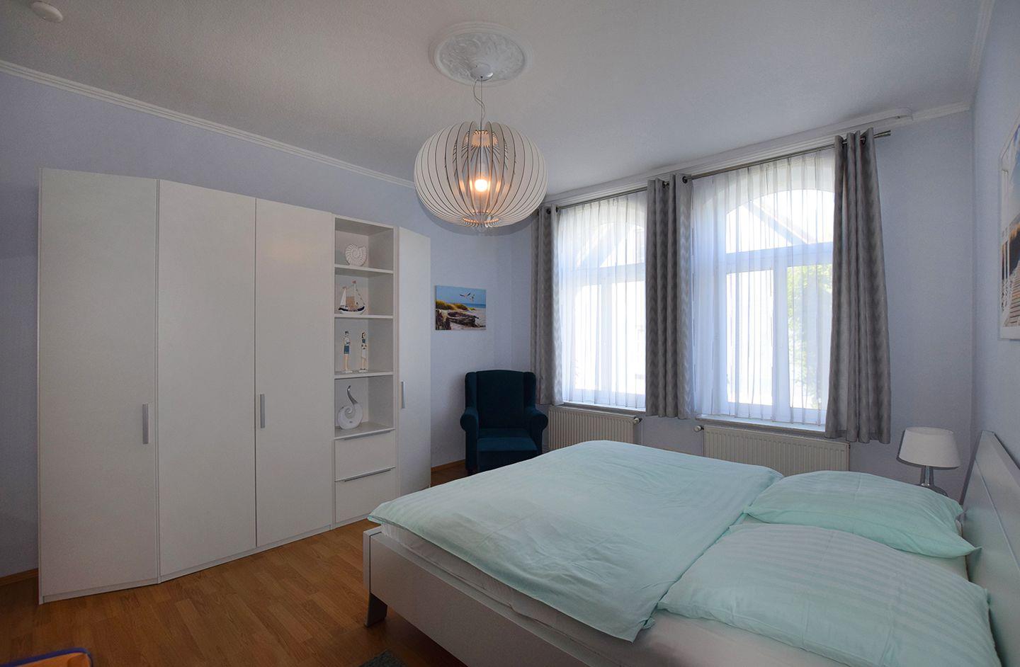 Ein separates Schlafzimmer mit einem großen Doppelbett (180 x 200 cm) und einem gemütlichen Sessel sorgt für entspannte Nächte. Ein Kinderbett ist ebenfalls vorhanden, sodass die Wohnung auch für kleine Familien geeignet ist. Das Badezimmer ist mit einer Dusche und WC ausgestattet.