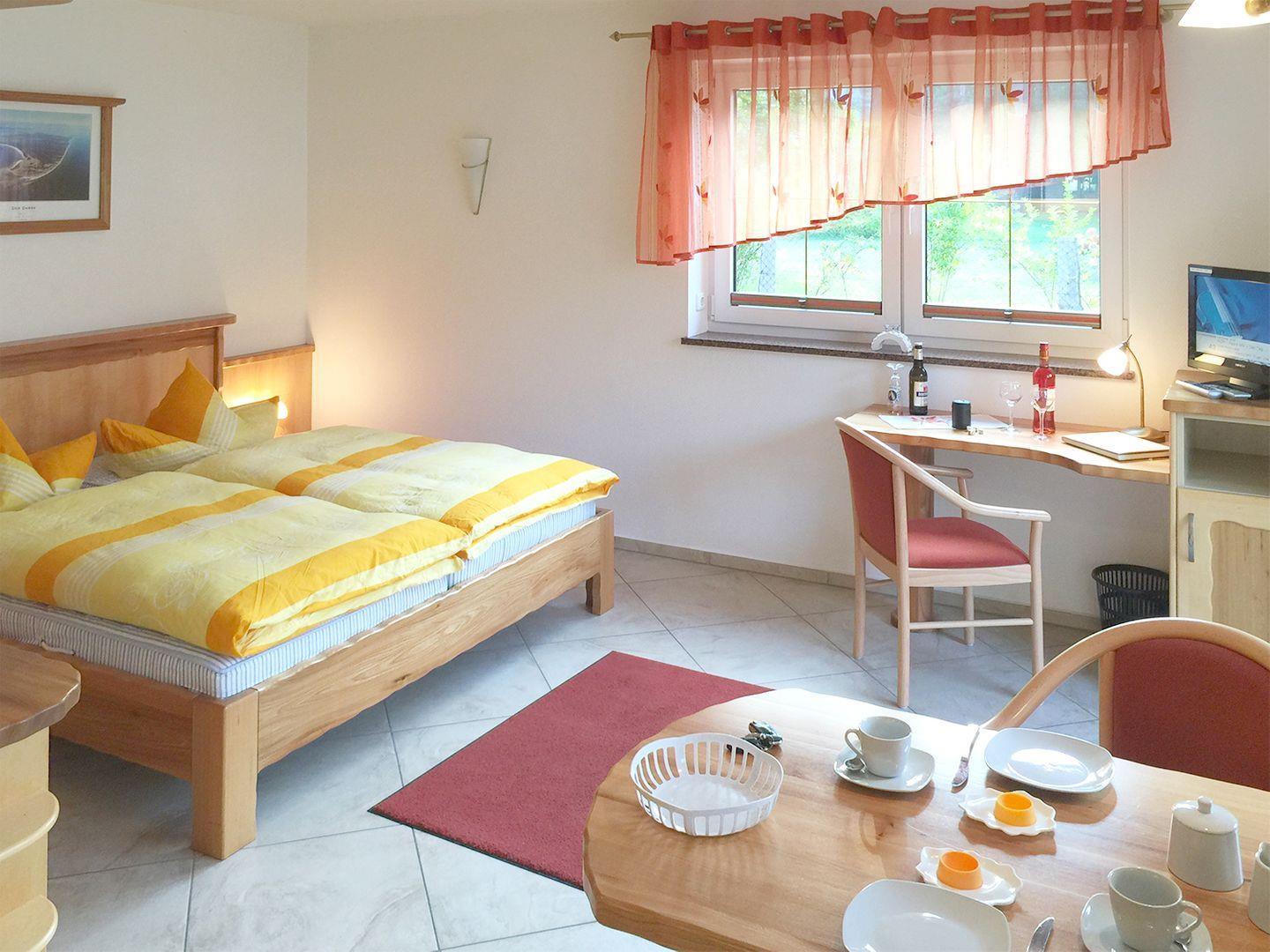 Dieses gemütliche Apartment für bis zu 2 Personen bietet auf ca. 30 m² eine komfortable Unterkunft im Erdgeschoss. Der Wohn-/Schlafraum ist mit einem Doppelbett (180 x 200 cm), einem Esstisch, einem Schreibtisch, sowie einem Flachbild-TV (SAT/Kabel) ausgestattet und bietet so alles, was für einen entspannten Aufenthalt benötigt wird.