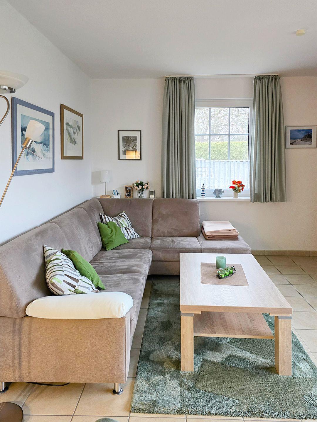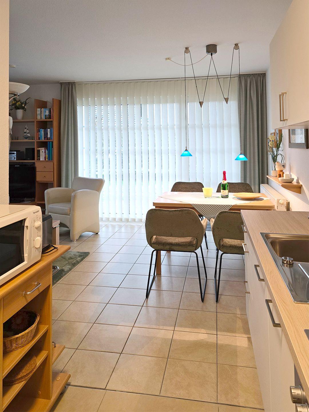 Ferienwohnung bis 4 Personen | ca. 52 m2 Wohnfläche | EG Wohnbereich mit Einbauküche, Bad, 2 Schlafzimmer | Süd-Terrasse | 1 Parkplatz | Wohnbereich Esstisch, Sitzgarnitur, Radio mit CD/DVD-Player, TV SAT/Kabel | Einbauküche Backofen, Geschirrspüler, Herd, Kaffeemaschine, Kühlschrank mit Gefrierfach, Toaster, Wasserkocher | Bad Dusche, Waschmaschine, WC | 2 Schlafzimmer 1 Doppelbett (180 x 200 cm), 1 Doppelbett (140 x 200 cm) | Kinderhochstuhl, WLAN | Gemeinschaftliche Nutzung von Fahrradschuppen, Grillecke, Sandkasten