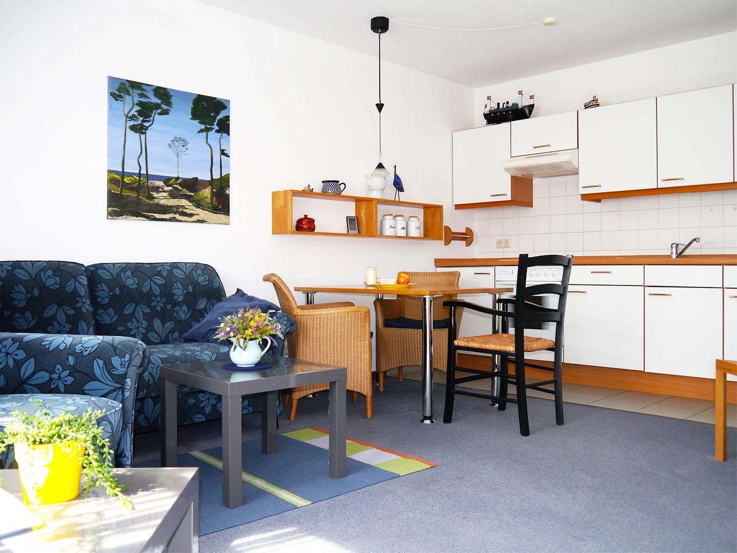 Diese gemütliche Ferienwohnung für bis zu 2 Personen bietet auf ca. 45 m² Wohnfläche alles, was für einen entspannten Aufenthalt notwendig ist. Im Obergeschoss befindet sich der einladende Wohnbereich, der mit einer komfortablen Sitzgarnitur, einem Esstisch sowie einem TV mit SAT/Kabel und einem Radio mit CD-Player ausgestattet ist. Die offene Einbauküche verfügt über einen Backofen, Herd, Kaffeemaschine, Kühlschrank mit Gefrierfach, Toaster und Wasserkocher – perfekt für die Zubereitung kleiner Mahlzeiten. Das Badezimmer ist mit einer Dusche und einem WC ausgestattet.