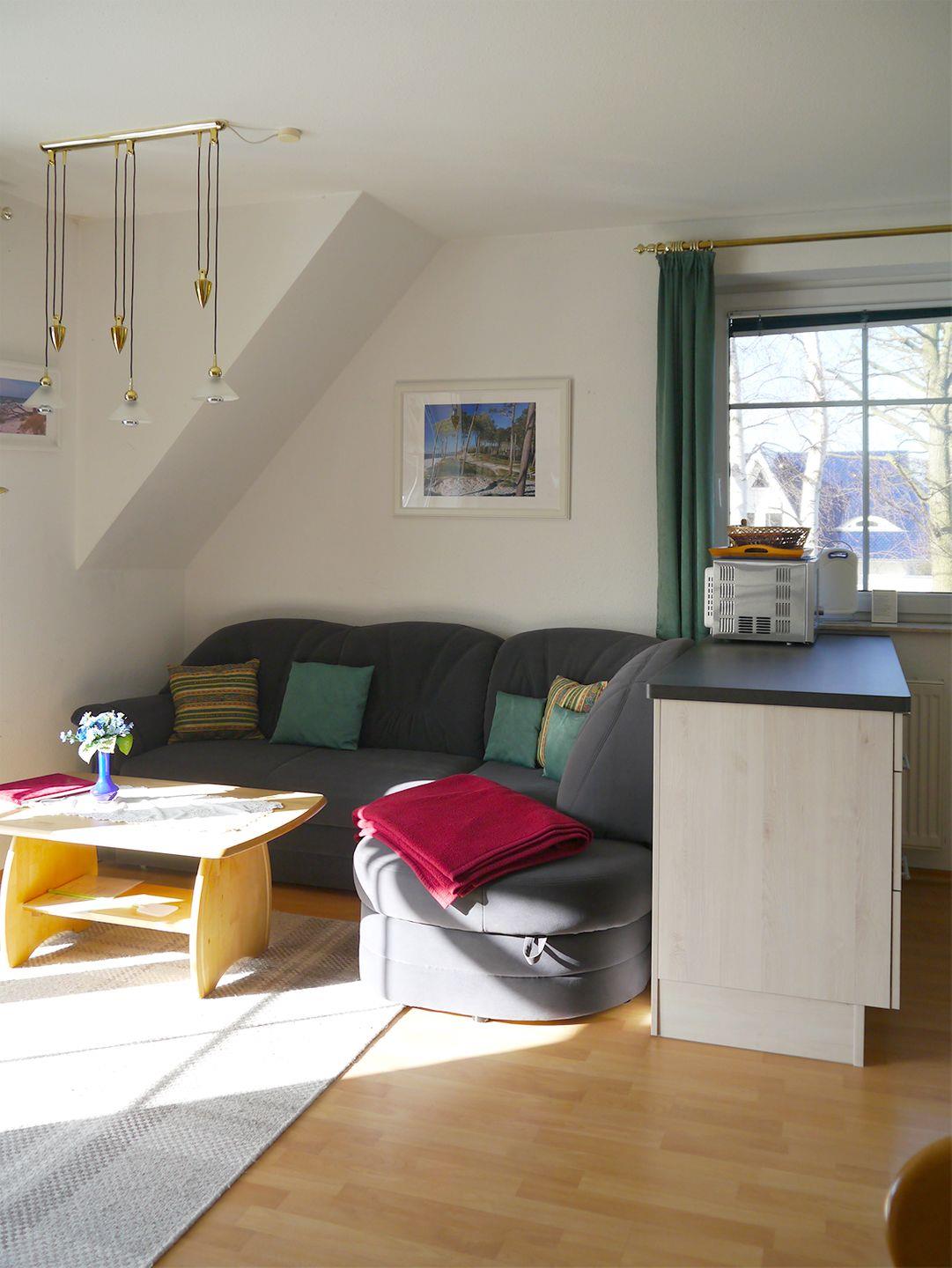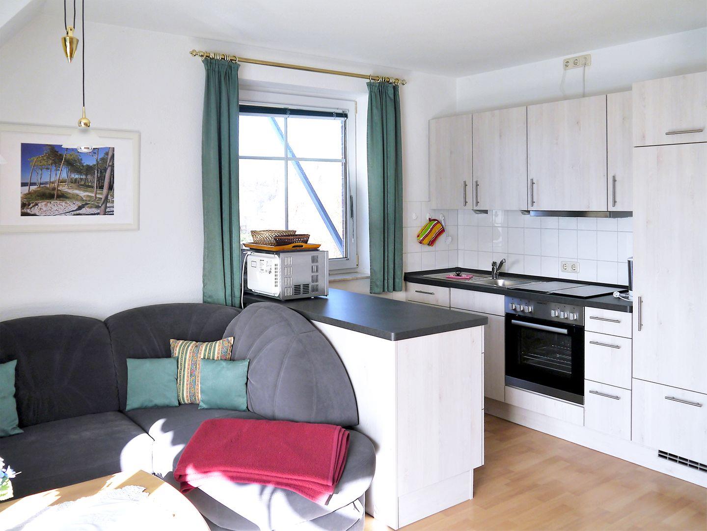 Diese gemütliche Ferienwohnung bietet auf ca. 50 m² Wohnfläche Platz für bis zu 4 Personen und befindet sich im Obergeschoss. Der offene Wohn- und Essbereich ist ausgestattet mit einem Esstisch, einer bequemen Sitzgarnitur, einem praktischen Schrankbett sowie einem Radio mit CD-Player und SAT-TV. Die gut ausgestattete Küchenzeile lässt keine Wünsche offen und bietet Ihnen alles, was Sie für die Zubereitung von Mahlzeiten benötigen: Backofen, Geschirrspüler, Herd, Kaffeemaschine, Kühlschrank mit Gefrierfach, Mikrowelle, Toaster und Wasserkocher.