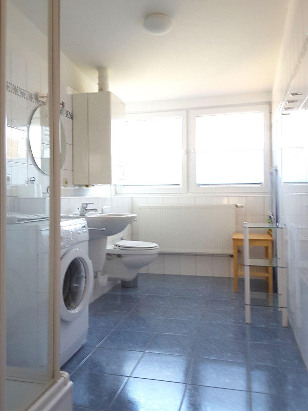 Das Badezimmer ist mit einer Dusche, WC und einer Waschmaschine ausgestattet.