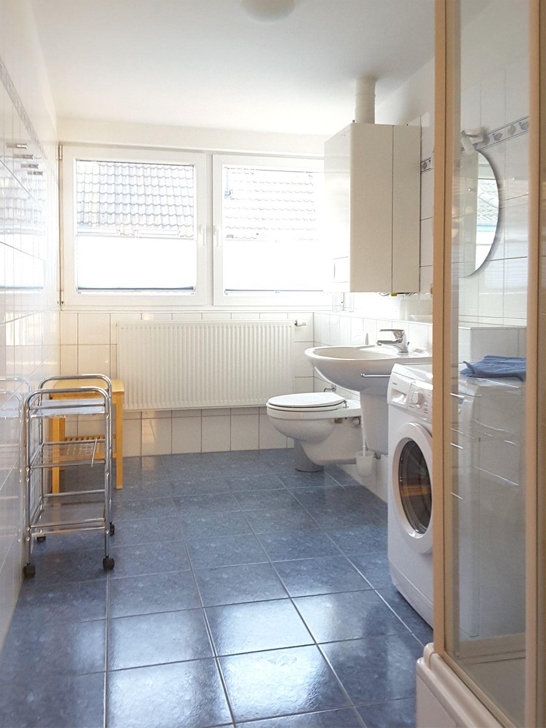 Das Badezimmer ist mit einer Dusche, WC und einer Waschmaschine ausgestattet.