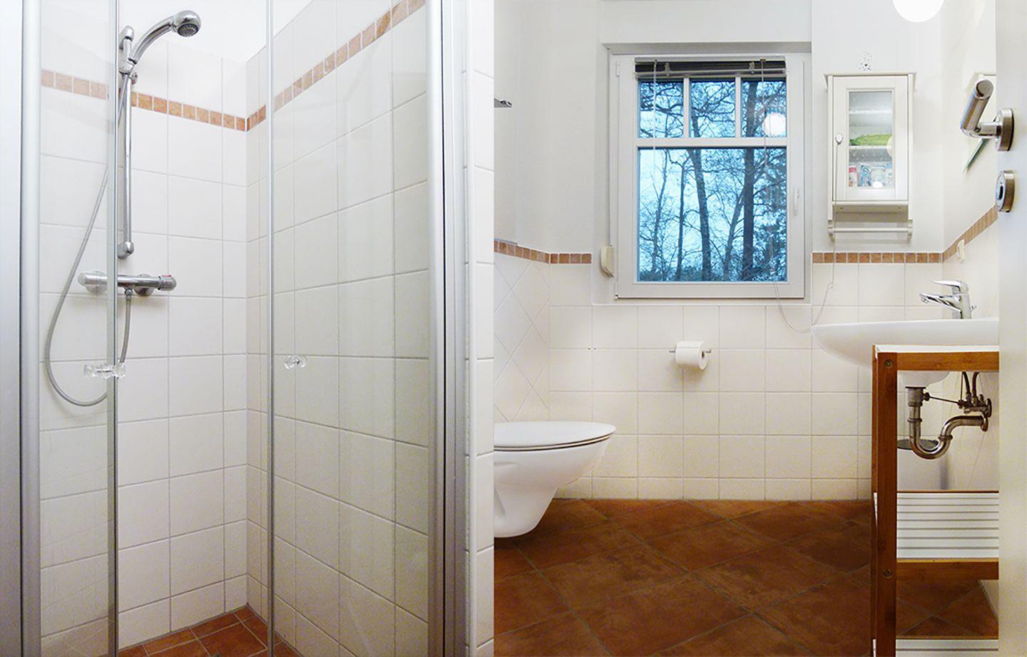 Das Badezimmer ist mit einem Fenster, einer Dusche und einem WC ausgestattet.