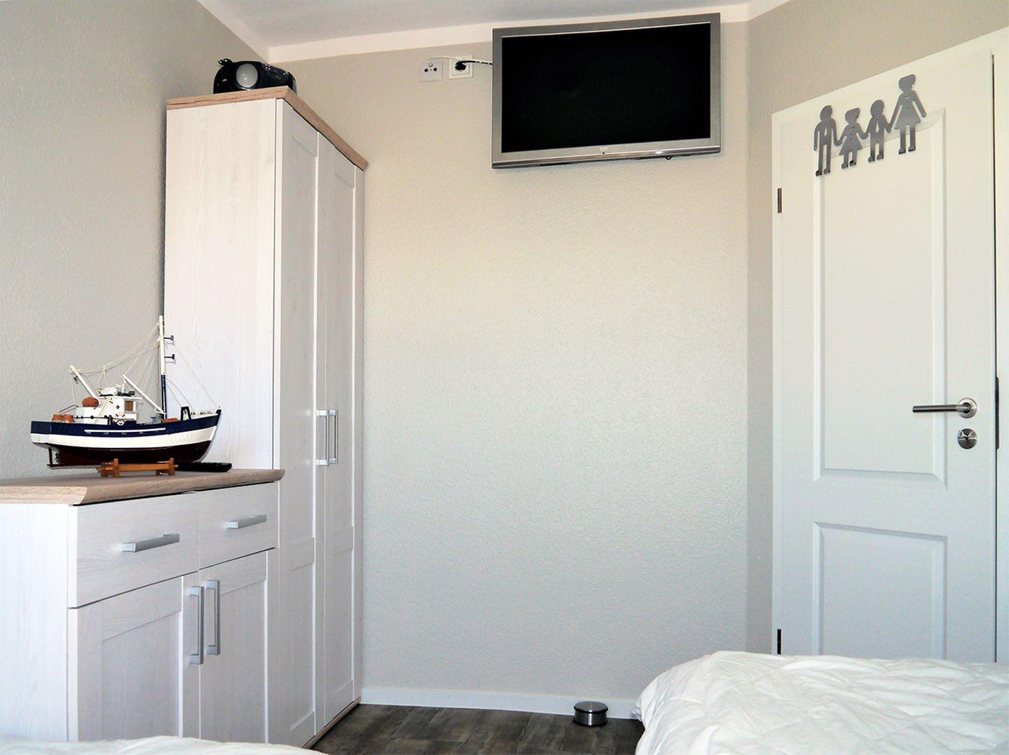 Die Ferienwohnung verfügt über zwei Schlafzimmer mit jeweils einem TV: Eines mit einem Doppelbett (180 x 200 cm, durchgehende Matratze) und eines mit zwei Einzelbetten (80 x 200 cm), ideal für Familien oder Freunde.