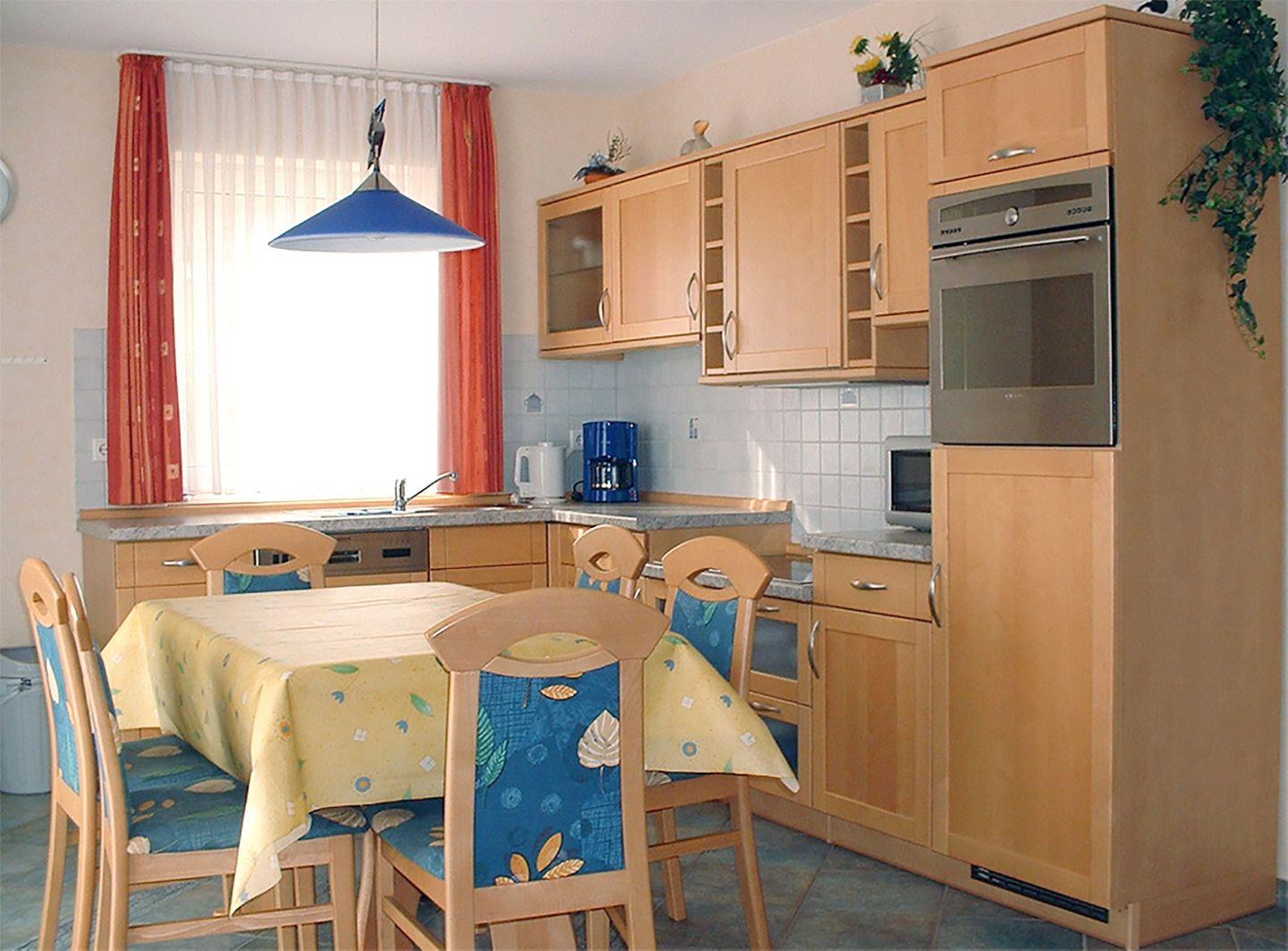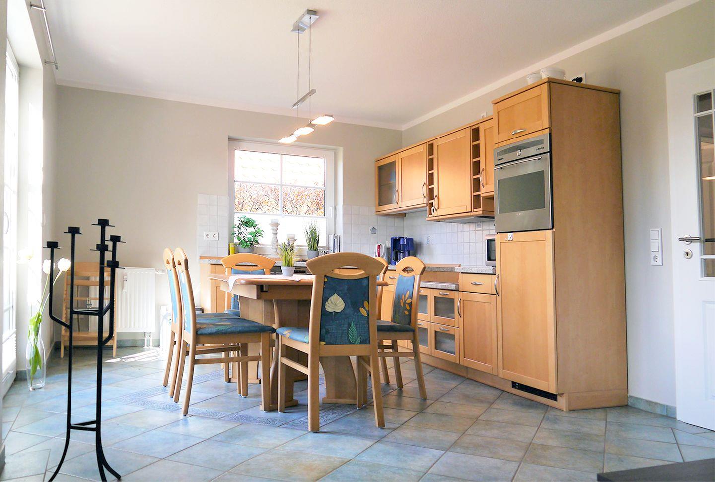 Die gut ausgestattete Einbauküche mit Backofen, Geschirrspüler, Herd, Kaffeemaschine, Kühlschrank mit Gefrierfach, Mikrowelle, Toaster und Wasserkocher lässt keine Wünsche offen.