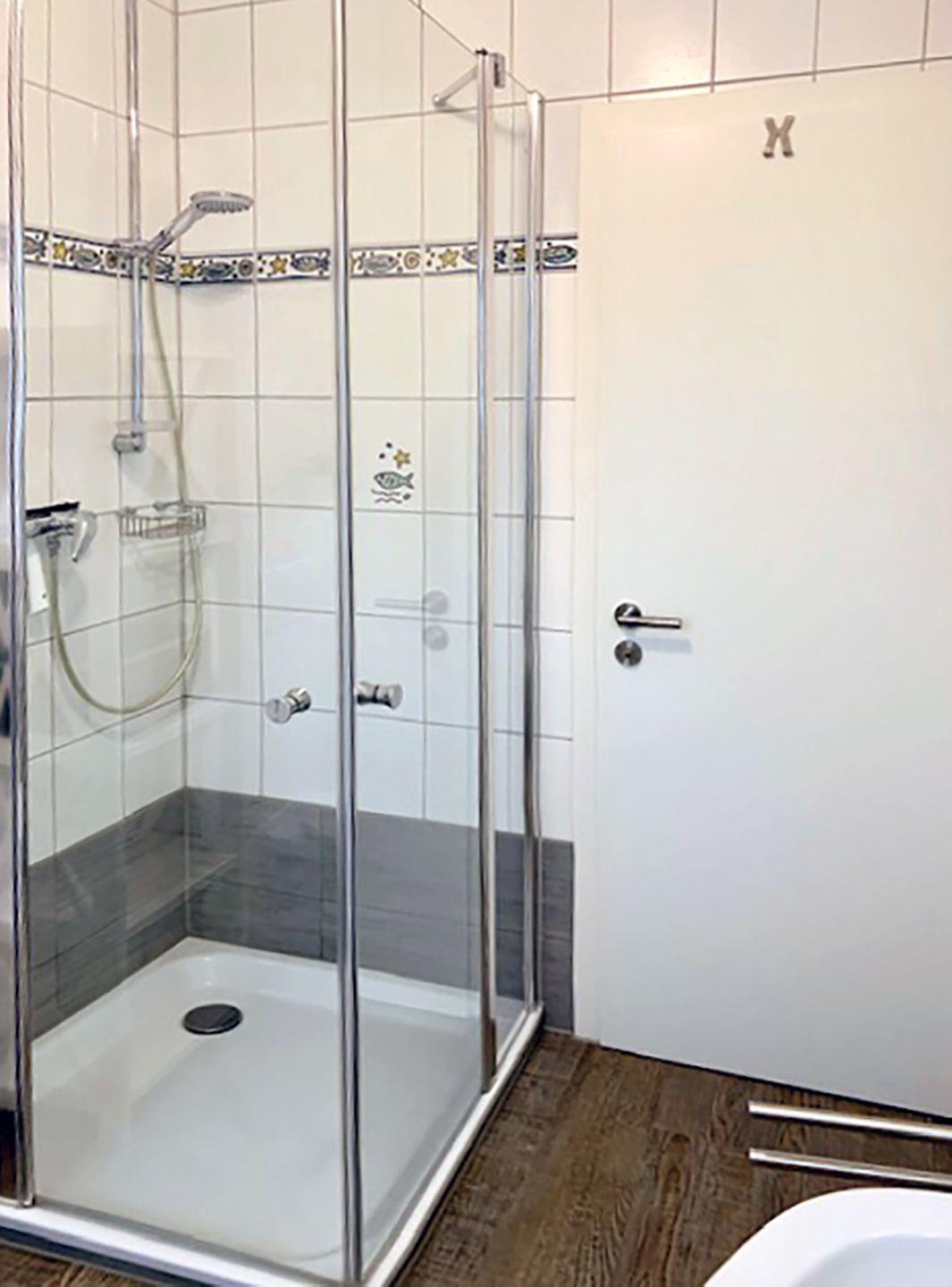 Das Badezimmer ist mit einer Dusche, einem WC und einer Waschmaschine ausgestattet, sodass Sie während Ihres Aufenthalts problemlos Wäsche waschen können.