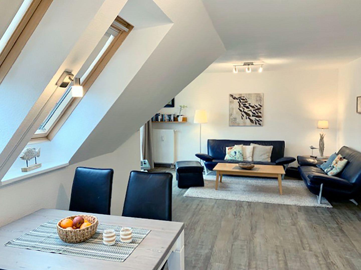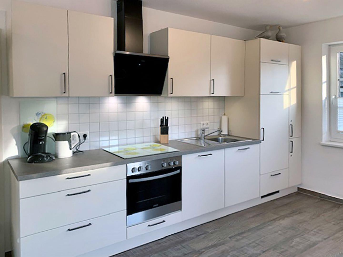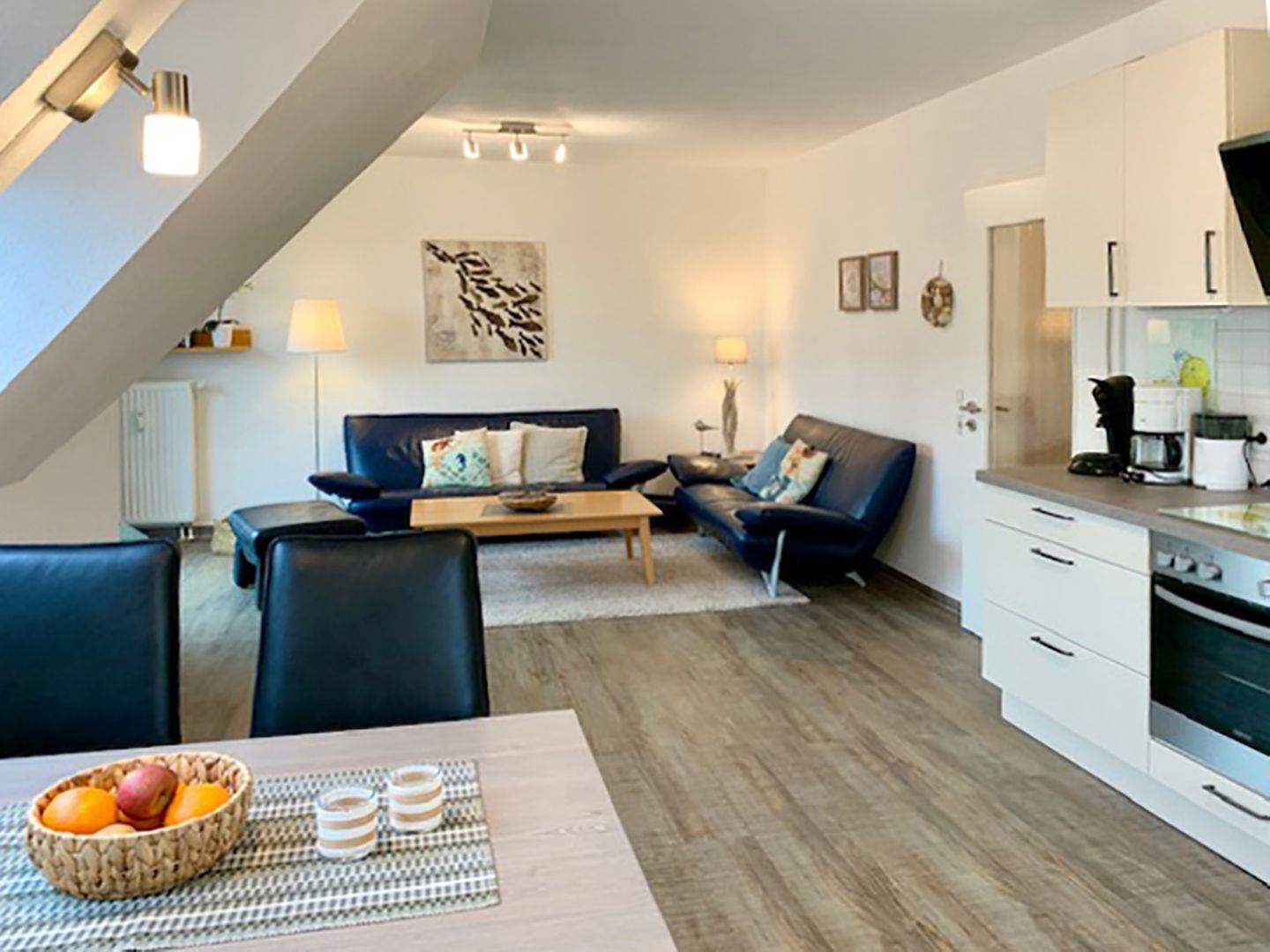 Die einladende Ferienwohnung für bis zu 4 Personen bietet auf ca. 63 m² ausreichend Platz und befindet sich im Obergeschoss eines gepflegten Hauses. Der großzügige Wohnbereich mit Esstisch, Sitzgarnitur, Radio mit CD/DVD-Player und SAT-TV ist der ideale Ort, um nach einem erlebnisreichen Tag zu entspannen. Die gut ausgestattete Einbauküche mit Backofen, Geschirrspüler, Herd, Kaffeemaschine, Kühlschrank mit Gefrierfach, Mikrowelle, Toaster und Wasserkocher lässt keine Wünsche offen.