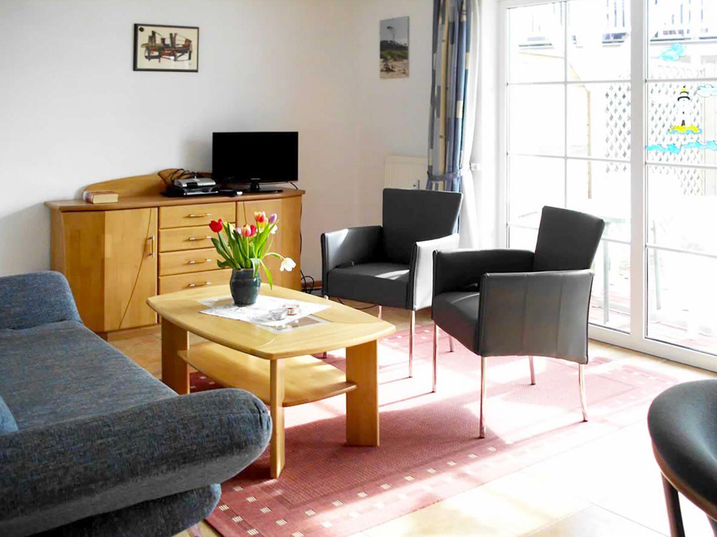 Die gemütliche Ferienwohnung für bis zu 4 Personen bietet auf ca. 57 m² Wohnfläche im Erdgeschoss alles, was Sie für einen erholsamen Urlaub benötigen. Der Wohn-/Essbereich ist mit einem bequemen Sofa, einem Esstisch sowie einem Radio mit CD/DVD-Player und SAT-TV ausgestattet, sodass Sie sich hier nach einem ereignisreichen Tag entspannen können.