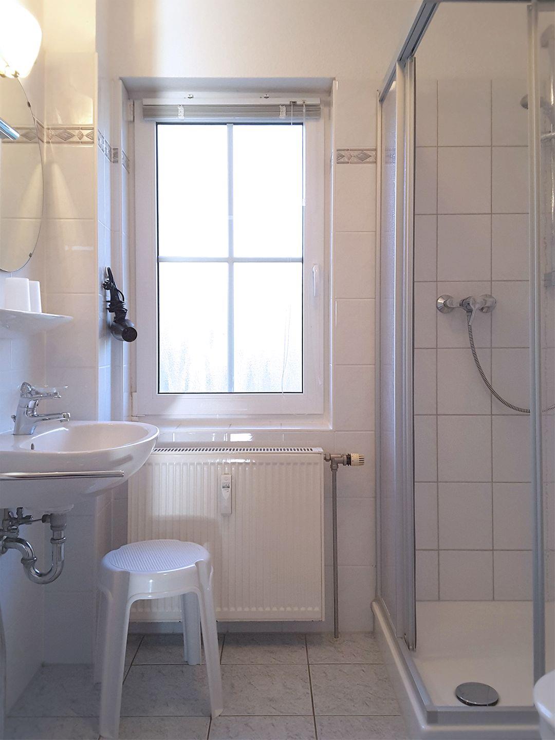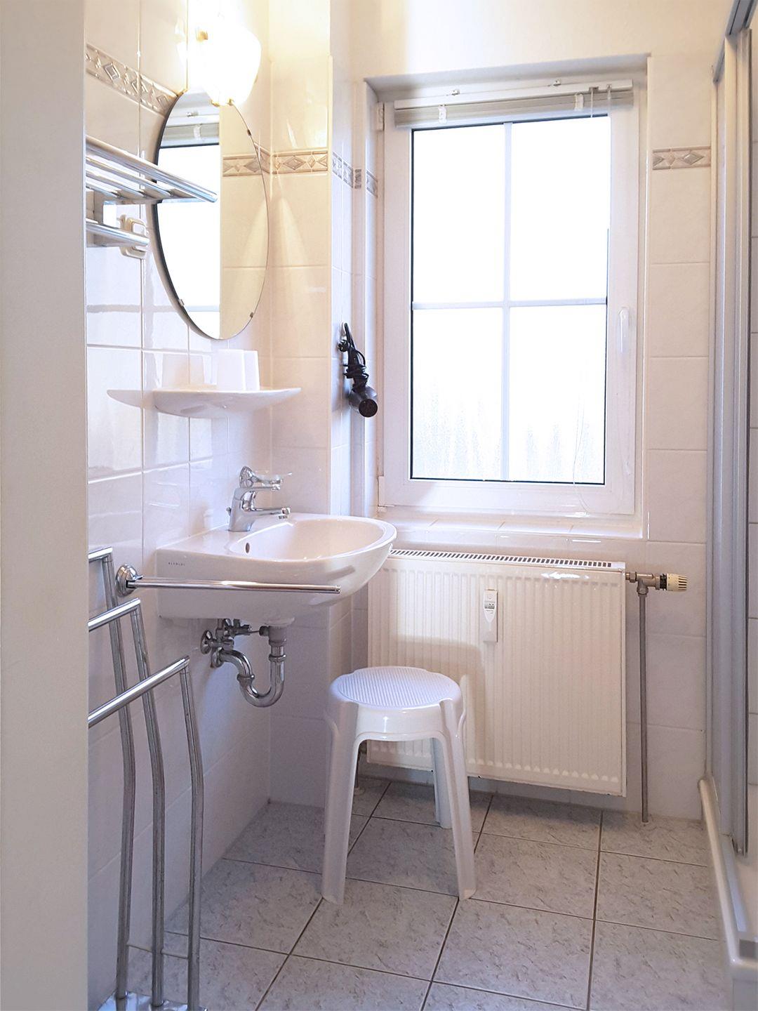 Das Badezimmer mit Fenster bietet eine Dusche, ein WC und eine Waschmaschine, sodass Sie während Ihres Aufenthalts gut versorgt sind.