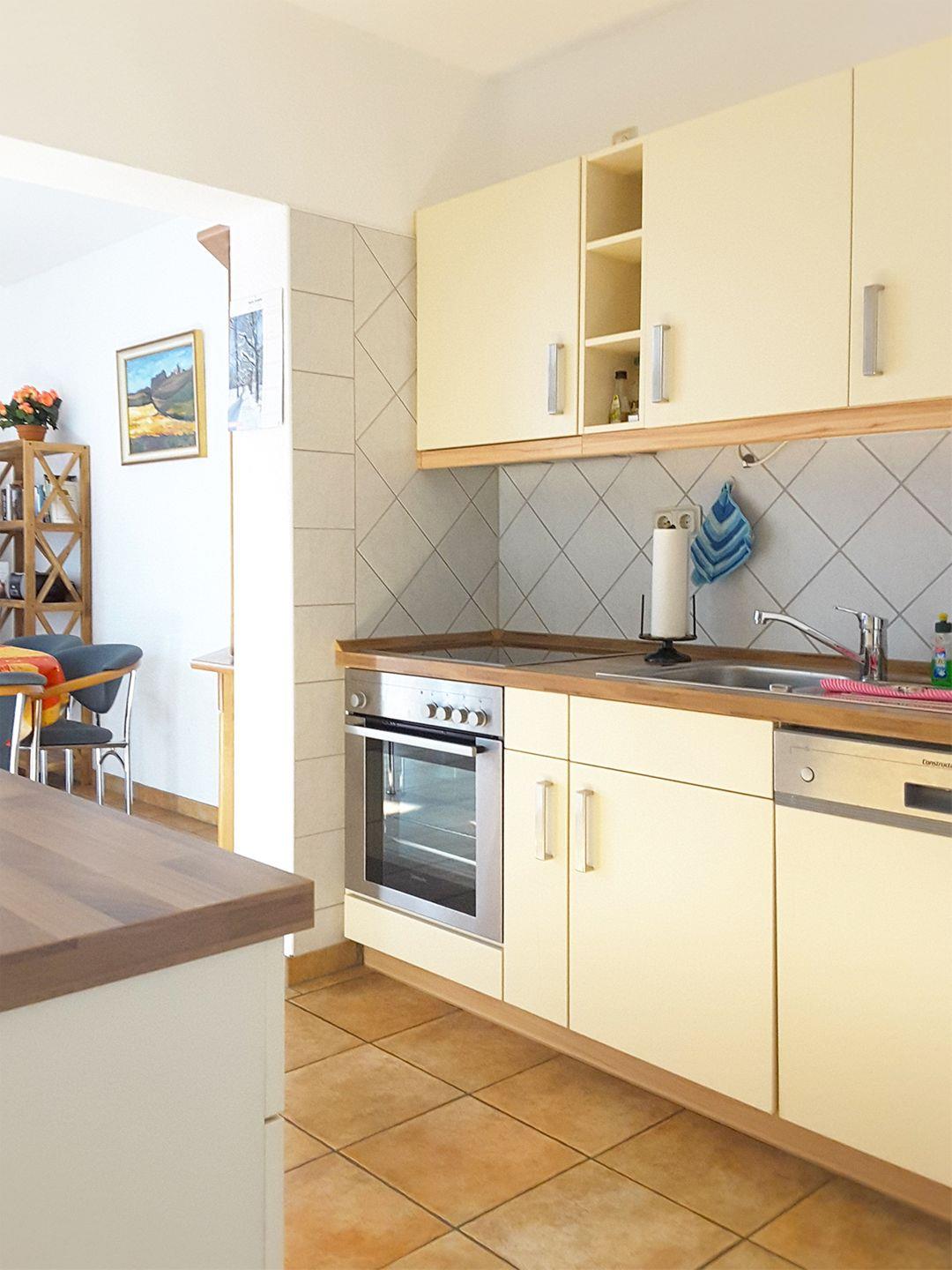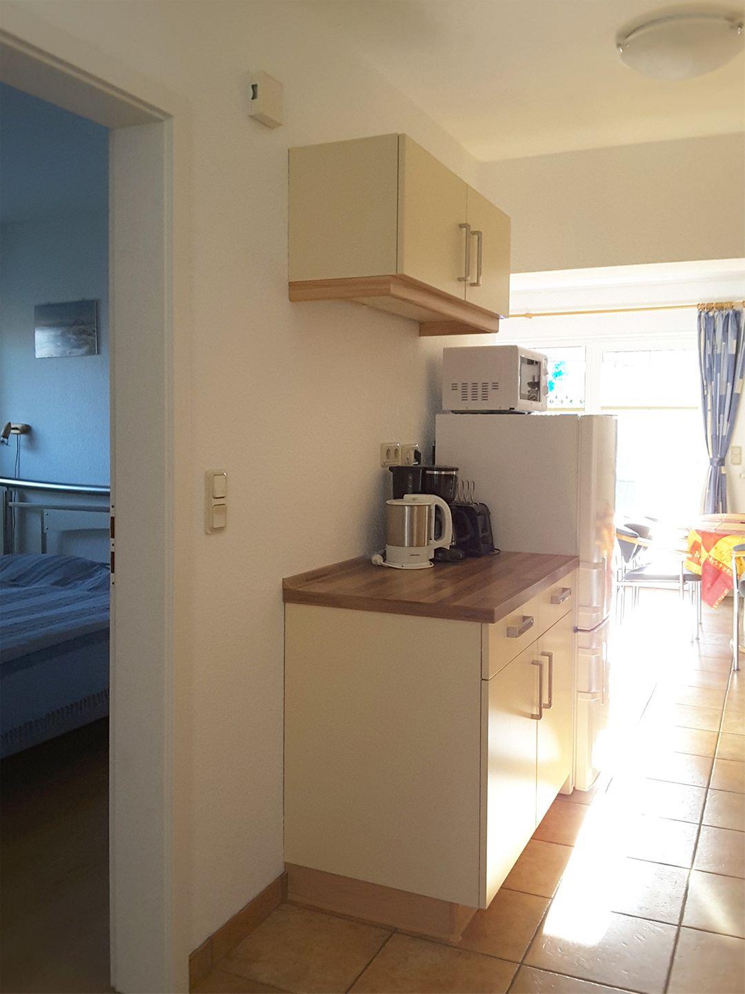 Die integrierte Küchenzeile lässt keine Wünsche offen: Sie verfügt über einen Backofen, Geschirrspüler, Herd/Cerankochfeld, Kaffeemaschine, Kühlschrank mit Gefrierfach, Mikrowelle, Toaster und Wasserkocher – perfekt für Selbstversorger.