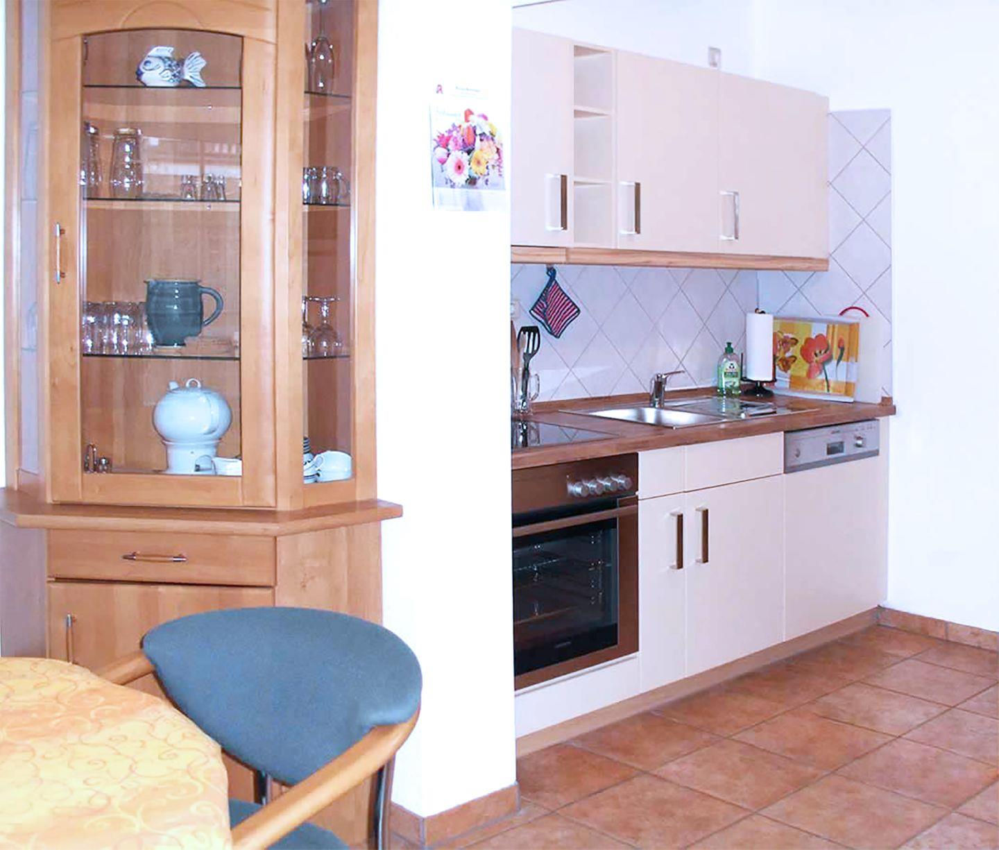 Ferienwohnung bis 4 Personen | Ca. 57 m2 Wohnfläche | EG Wohn-/Essbereich, Küchenzeile, Bad, 2 Schlafzimmer | Süd-Terrasse | 1 Parkplatz | Wohn-/Essbereich Esstisch, Sofaecke, Radio mit CD/DVD-Player, TV SAT/Kabel | Küchenzeile Backofen, Geschirrspüler, Herd/Cerankochfeld, Kaffeemaschine, Kühlschrank mit Gefrierfach, Mikrowelle, Toaster, Wasserkocher | Bad mit Fenster, Dusche, WC | 2 Schlafzimmer SZ 1 mit 1 Doppelbett (180 x 200 cm), Kleiderschrank, Kommode | SZ 2 mit 1 Doppelbett (140 x 200 cm), Kleiderschrank | Inkl. Fahrradschuppen, Kinderhochstuhl, Reisebett, Terrasse mit Gartenmöbeln, Waschmaschine, WLAN