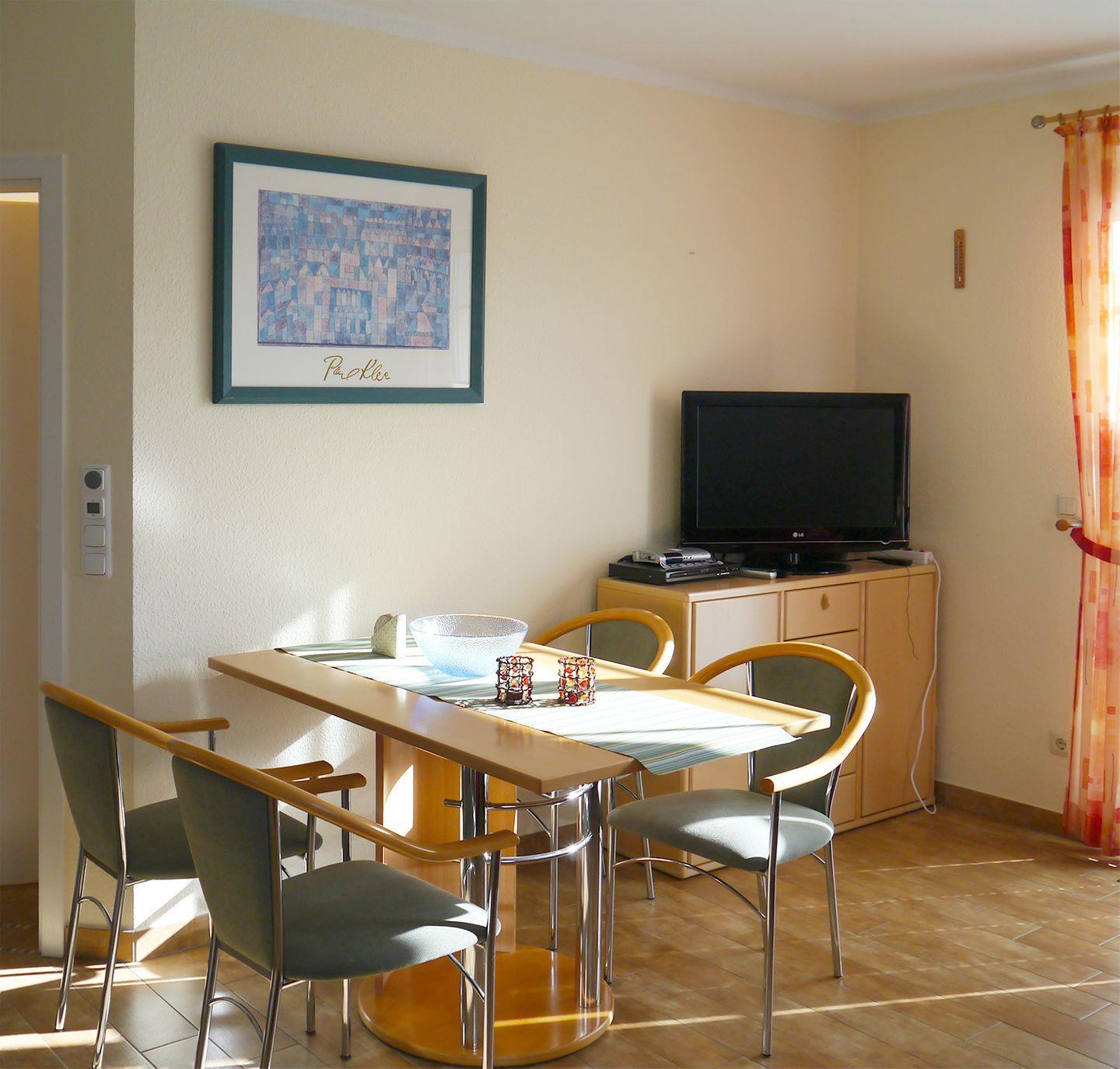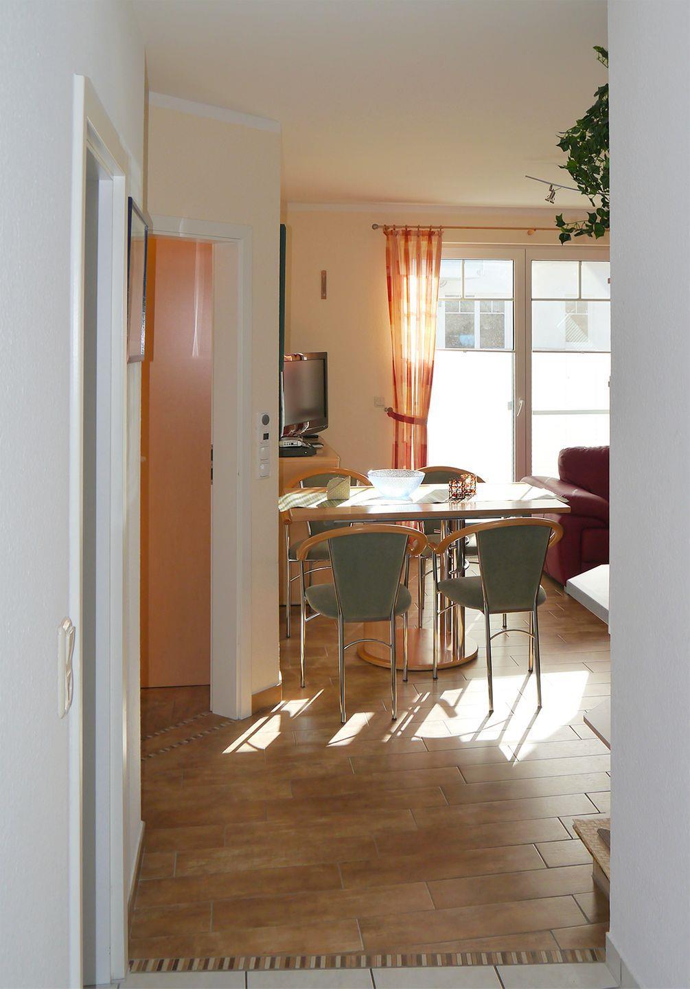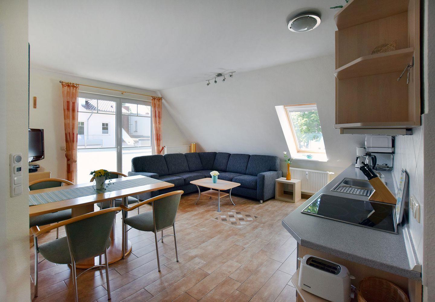 Die gemütliche Ferienwohnung für bis zu 4 Personen bietet auf ca. 56 m² Wohnfläche viel Platz für einen entspannten Aufenthalt. Im Obergeschoss befindet sich der helle Wohn-/Essbereich, der mit einem Esstisch, einer bequemen Sitzgarnitur sowie einem Radio mit CD/DVD-Player und SAT-TV ausgestattet ist – ideal für gemütliche Abende.
