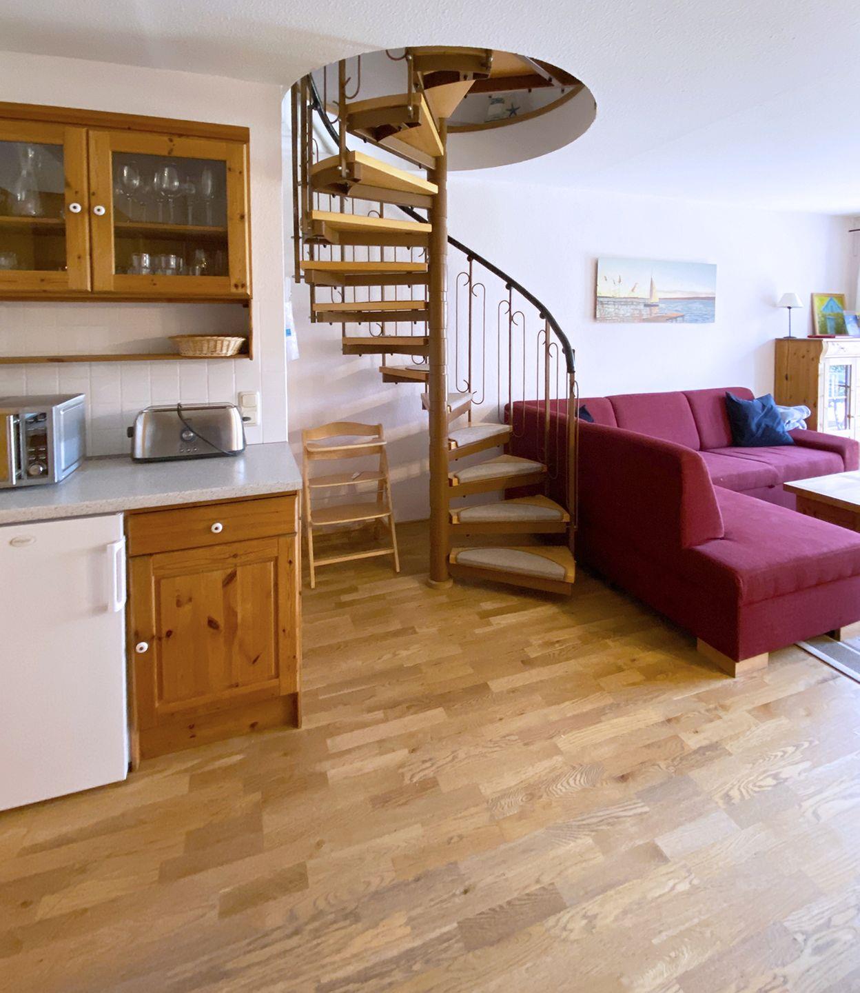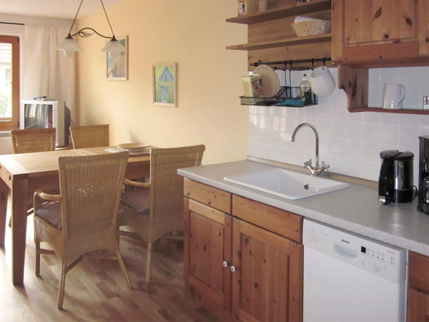 Das Mittelreihenhaus für bis zu 4 Personen bietet auf ca. 64 m² Wohnfläche im Erdgeschoss einen großzügigen Wohn-/Essbereich mit Esstisch, Sitzecke, Radio mit CD-Player und Flachbild-TV mit SAT/Kabel. Die offene Küchenzeile ist bestens ausgestattet mit einem Backofen, Geschirrspüler, Herd mit Cerankochfeld, Kaffeemaschine, Kühlschrank mit Gefrierfach, Mikrowelle, Toaster und Wasserkocher. Ein praktischer Abstellraum sorgt für zusätzlichen Stauraum. Im Erdgeschoss befindet sich außerdem ein Badezimmer mit Dusche und WC.
