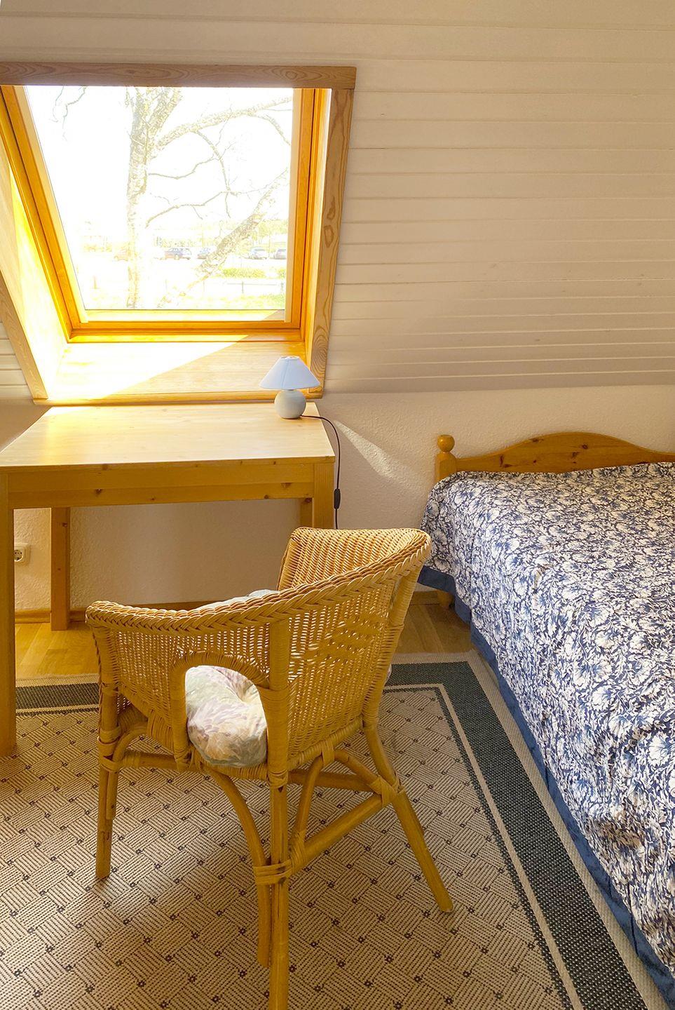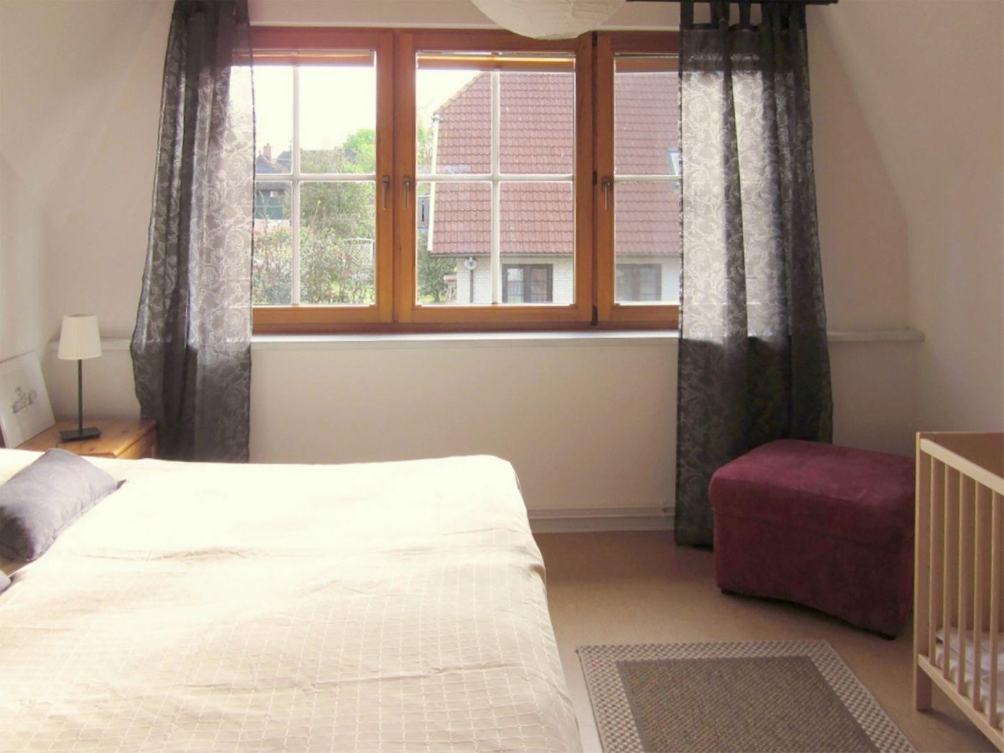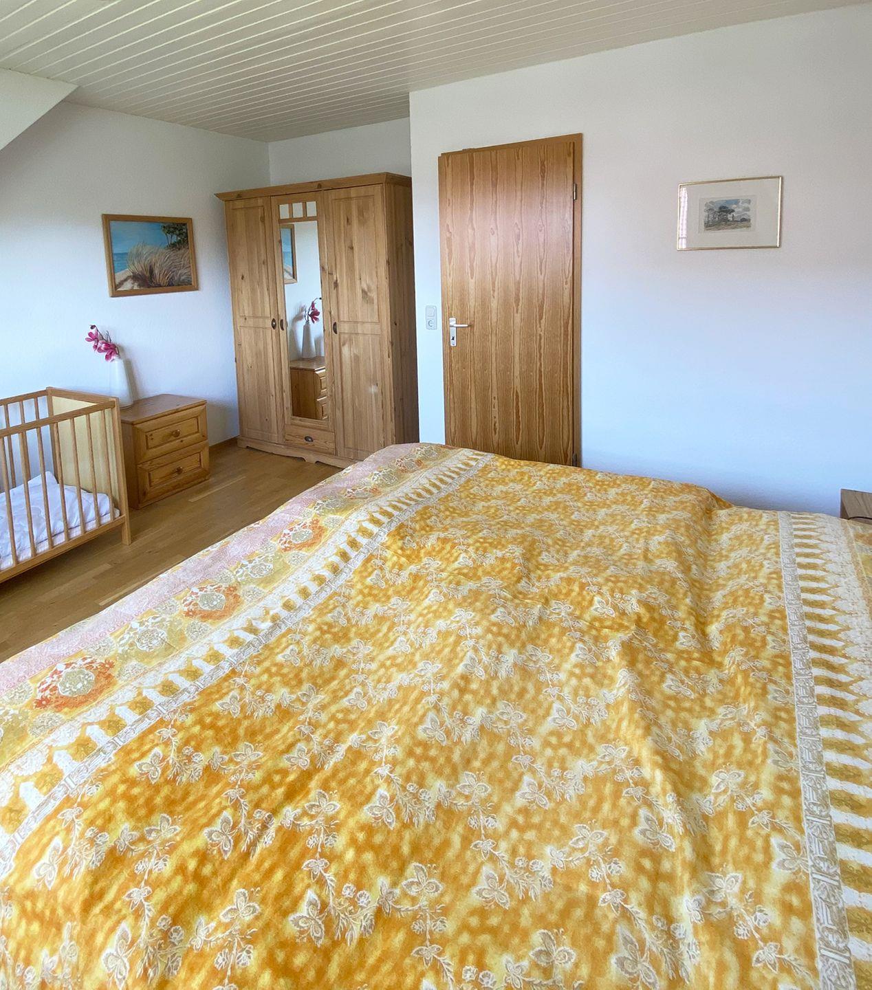 Im Obergeschoss gibt es zwei Schlafzimmer: Das erste Schlafzimmer ist mit einem Doppelbett (180 x 200 cm) und einem Kinderbett ausgestattet, das zweite Schlafzimmer mit zwei Einzelbetten (90 x 200 cm). Ein weiteres WC befindet sich ebenfalls im Obergeschoss.