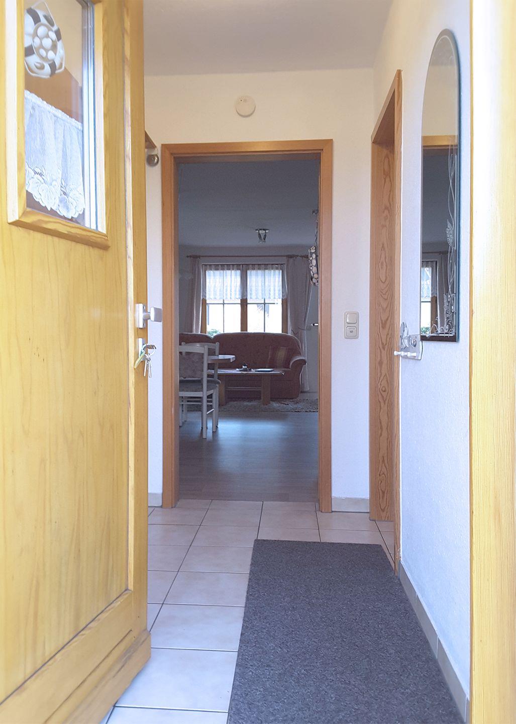 Ferienhaushälfte bis 4 Personen | Haustiere möglich | ca. 64 m² Wohnfläche | EG Wohn-/Essbereich, Küchenzeile, Bad, Abstellraum | DG 2 Schlafzimmer, WC | Süd-West-Terrasse | 1 Parkplatz | Wohn-/Essbereich Esstisch, Sitzecke, Radio mit CD-Player, TV SAT/Kabel, DVD-Player | Küchenzeile mit Backofen, Geschirrspüler, Herd, Kaffeemaschine, Kühlschrank mit Gefrierfach, Mikrowelle, Toaster, Wasserkocher | Duschbad, WC im EG | Gäste-WC im OG | 2 Schlafzimmer im OG: 1 Doppelbett (180 x 200 cm) | 2 Einzelbetten (90 x 200 cm) | Fahrradschuppen, großer Garten, Kinderhochstuhl, Reisebett, Treppenkindersicherung, Waschmaschine und Trockner, WLAN vorhanden